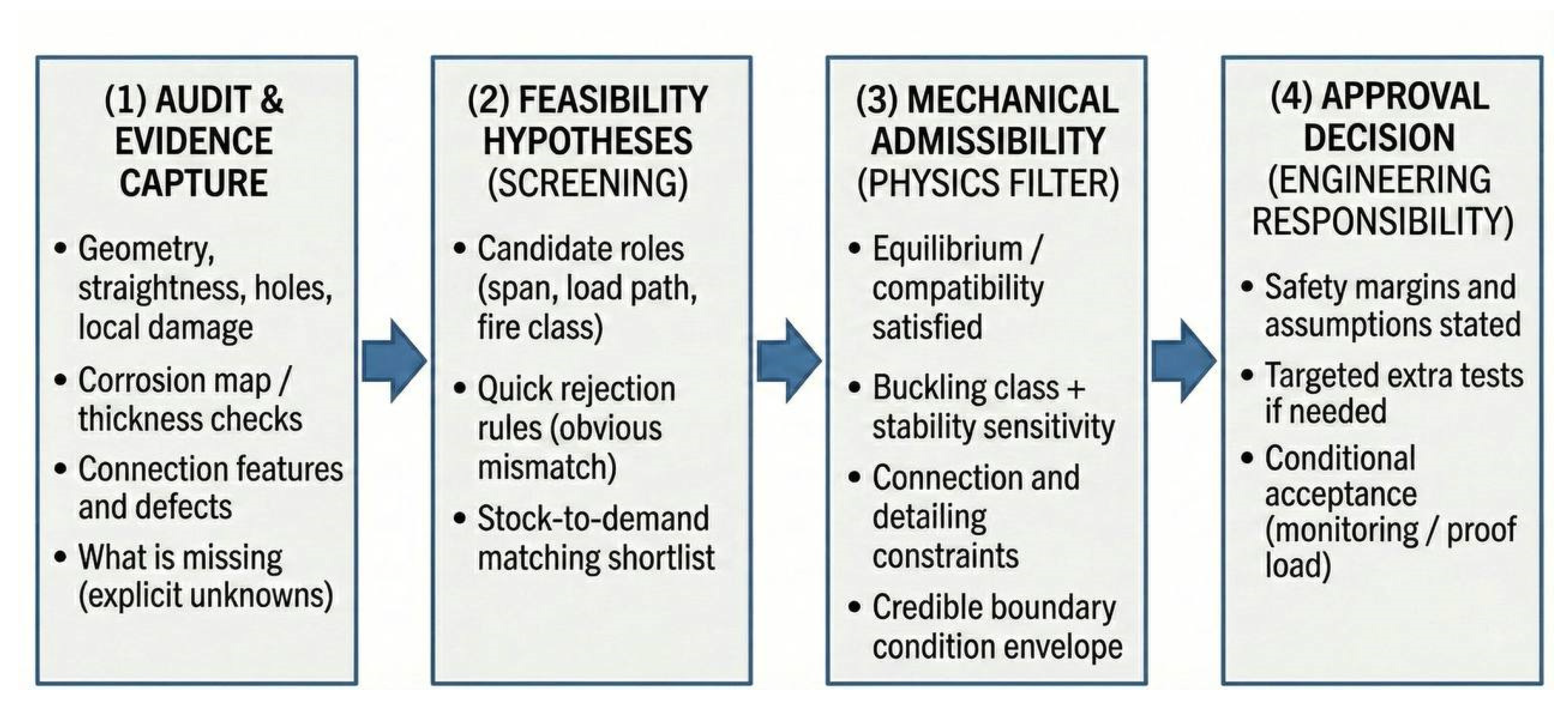 Figure 5 summarizes this reuse logic as a decision pipeline from evidence capture to approval, separating feasibility, mechanical admissibility, and approval, and clarifying where engineering judgement remains essential.