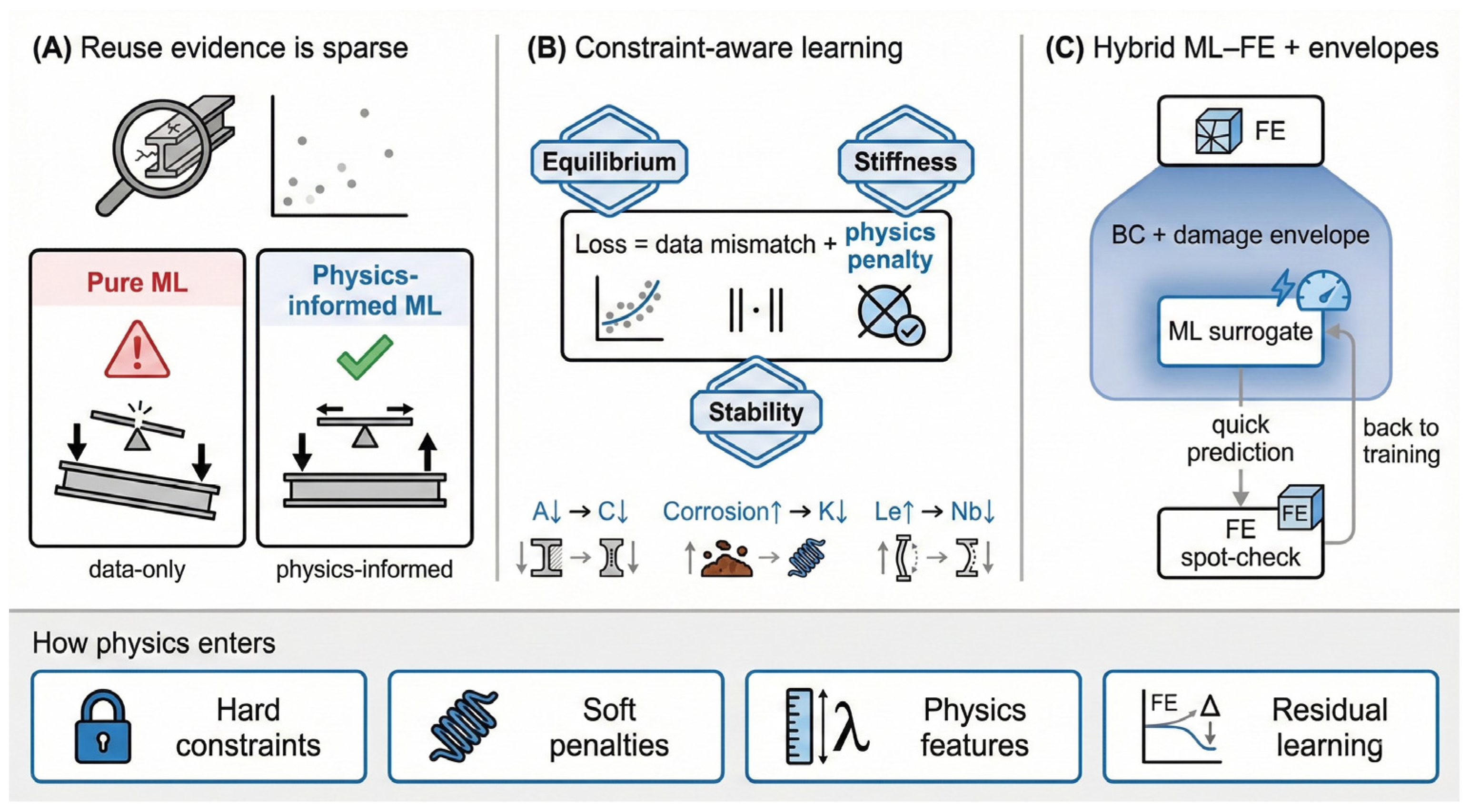 Physics-informed and hybrid learning approaches have been proposed in many forms across structural mechanics and engineering applications. In the context of this paper, the discussion is intentionally limited to those formulations that influence admissibility, uncertainty control, and decision robustness in steel reuse, rather than to physics-informed learning in its most general form.