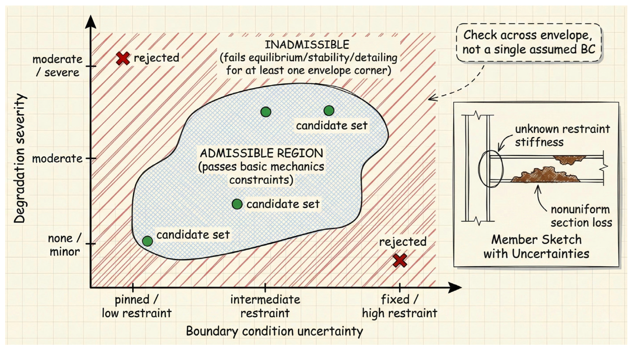 Figure 7 illustrates the admissibility envelope idea: reused members should be checked over a plausible range of boundary conditions and degradation states, and only candidates that remain admissible across this envelope should proceed to approval logic.