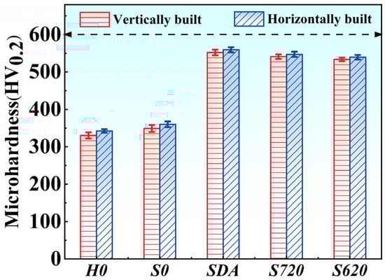 After heat treatment, the SDA, S720, and S620 samples undergo recrystallization. The dissolution of the Laves phases and the concomitant precipitation of strengthening phases led to a significant increase in the microhardness. The significant increase in the microhardness after heat treatment is primarily attributed to precipitation strengthening of the γ″ and γ′ phases. Among these, the SDA sample exhibits the highest average microhardness (552 HV0.2), which is attributed to the simultaneous precipitation of substantial γ″ and γ′ phases during the double aging treatment at 720 °C + 620 °C. In contrast, the S720 sample exhibits a lower average microhardness (541 HV0.2) than the SDA sample, which is consistent with its predominant precipitation of the γ″ phase. The S620 sample, which is predominantly strengthened by the secondary γ′ phase, exhibits a corresponding further reduction in average microhardness (534 HV0.2) compared to the S720 sample. Notably, due to the rapid melting and solidification characteristics of LPBF, the alloy develops a columnar/cellular structure along the longitudinal section and a cellular structure on the transverse section. This microstructural anisotropy leads to significant variations in mechanical properties across different orientations.