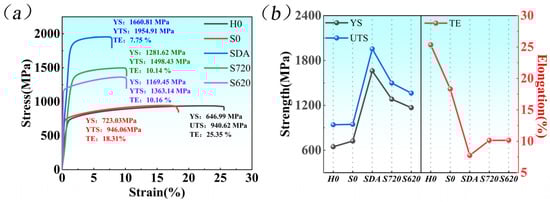 The tensile strengths of the SDA-S620 samples were significantly improved after heat treatment. This is due to the combined effects of the dissolution of Laves phases, simultaneous precipitation of both γ″ and γ′ phases, and homogenization of microstructure. However, the abundant strengthening phases precipitated in the heat-treated samples increase the resistance to dislocation movement and hinder dislocation multiplication, thereby reducing the alloy’s plasticity. When the two-stage aging is 720 °C × 8 h (FC) + 620 °C × 8 h (AC), the SDA sample exhibited peak mechanical properties: a yield strength of 1660.81 MPa and an ultimate tensile strength of 1954.91 MPa. These values represent increases of 129.7% and 106.6%, respectively, compared to those of the S0 sample. Conversely, its elongation is reduced to 7.75%. When the aging temperature is 720 °C and 620 °C, the S720 and S620 samples exhibit lower ultimate tensile strengths than the SDA sample (1498.43 and 1363.14 MPa, respectively). This is attributed to the predominant precipitation of a single type of strengthening phase. However, their elongation recovered to 10.14% and 10.16%, respectively.
