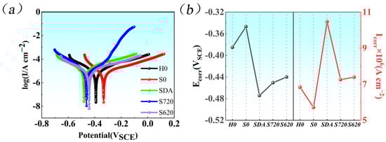 The polarization curves of all specimens exhibit a characteristic activation-passivation transition (Figure 11a). The anodic current density increases linearly with the potential, corresponding to the active dissolution region. A subsequent sharp rise in potential signifies the formation of a passive film on the alloy surface and the establishment of a stable passive state.