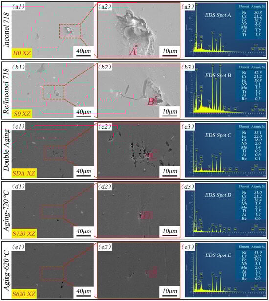 A comparison of Re content between the S0 (Figure 4c,f) and SDA (Figure 5(a3) and Figure 7(a3)) samples shows a significant decrease after heat treatment, from 77% (longitudinal section) and 84.5% (transverse section) to 18.0% (longitudinal section) and 23.5% (transverse section), respectively. This indicates that the Re content in the locally enriched regions decreases after heat treatment. This phenomenon can be attributed to an inferred mechanism whereby the heat treatment promoted Re diffusion, resulting in a sharp decrease in its content within the locally enriched regions.