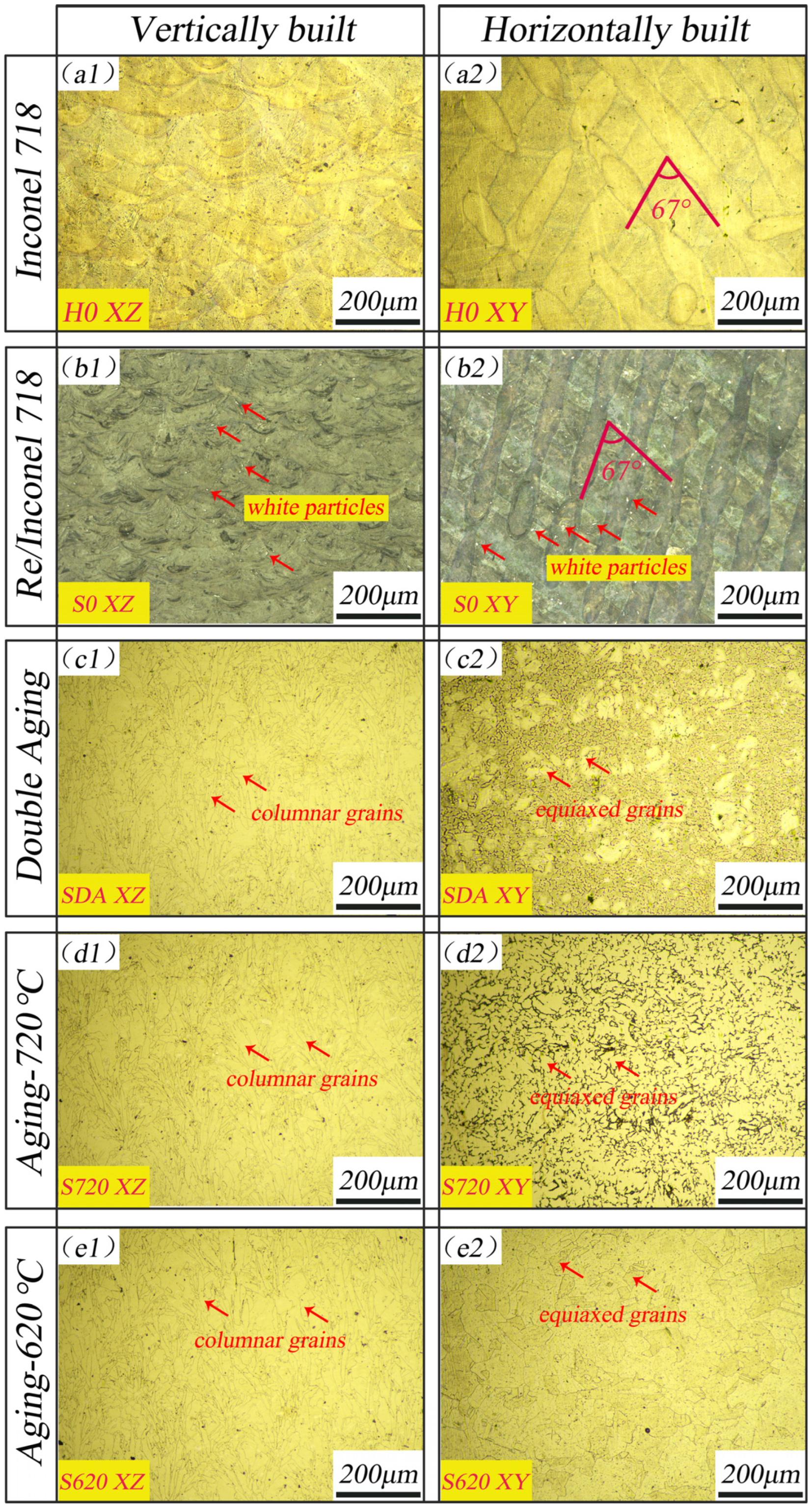 - Bai, P.; Wang, M.; Li, J.; Bai, J.; Zhang, J.; Wang, Z.; Niu, B.; Xing, J.; Liao, Y. Effects of heat treatment on microstructure and mechanical properties of Re/Inconel 718 composites fabricated by laser powder bed fusion. J. Mater. Res. Technol. 2026, 40, 1466–1485. [Google Scholar] [CrossRef]