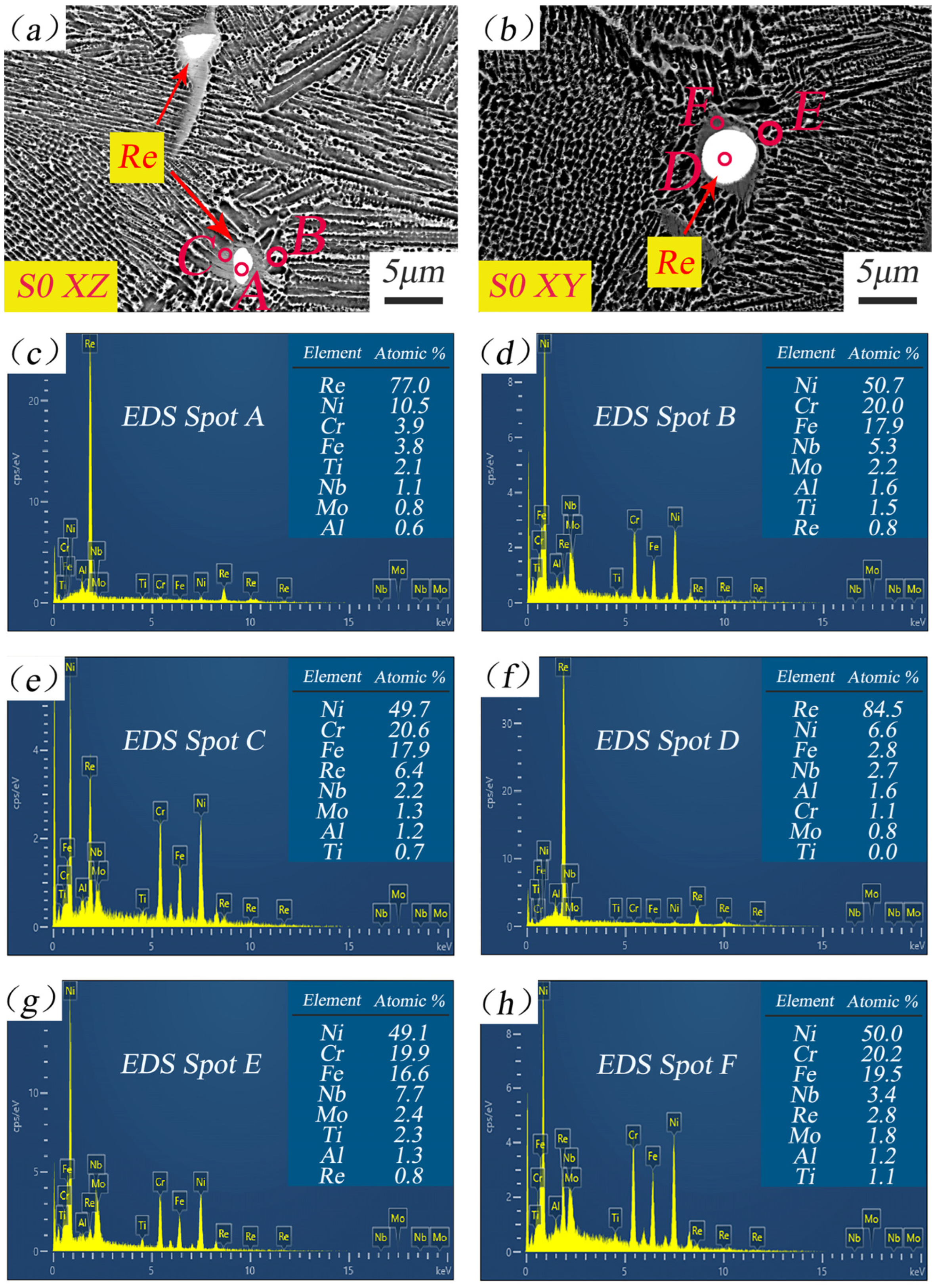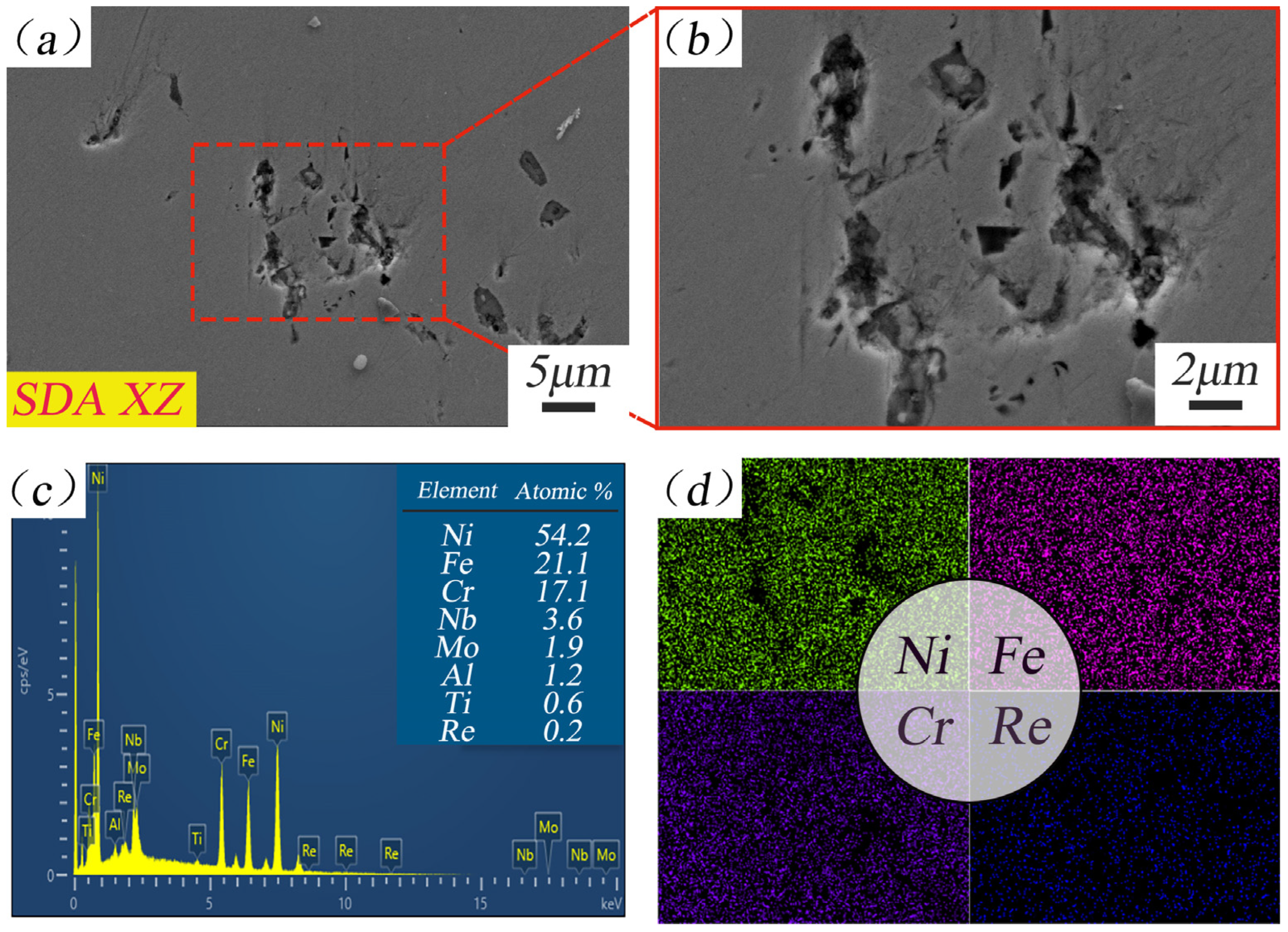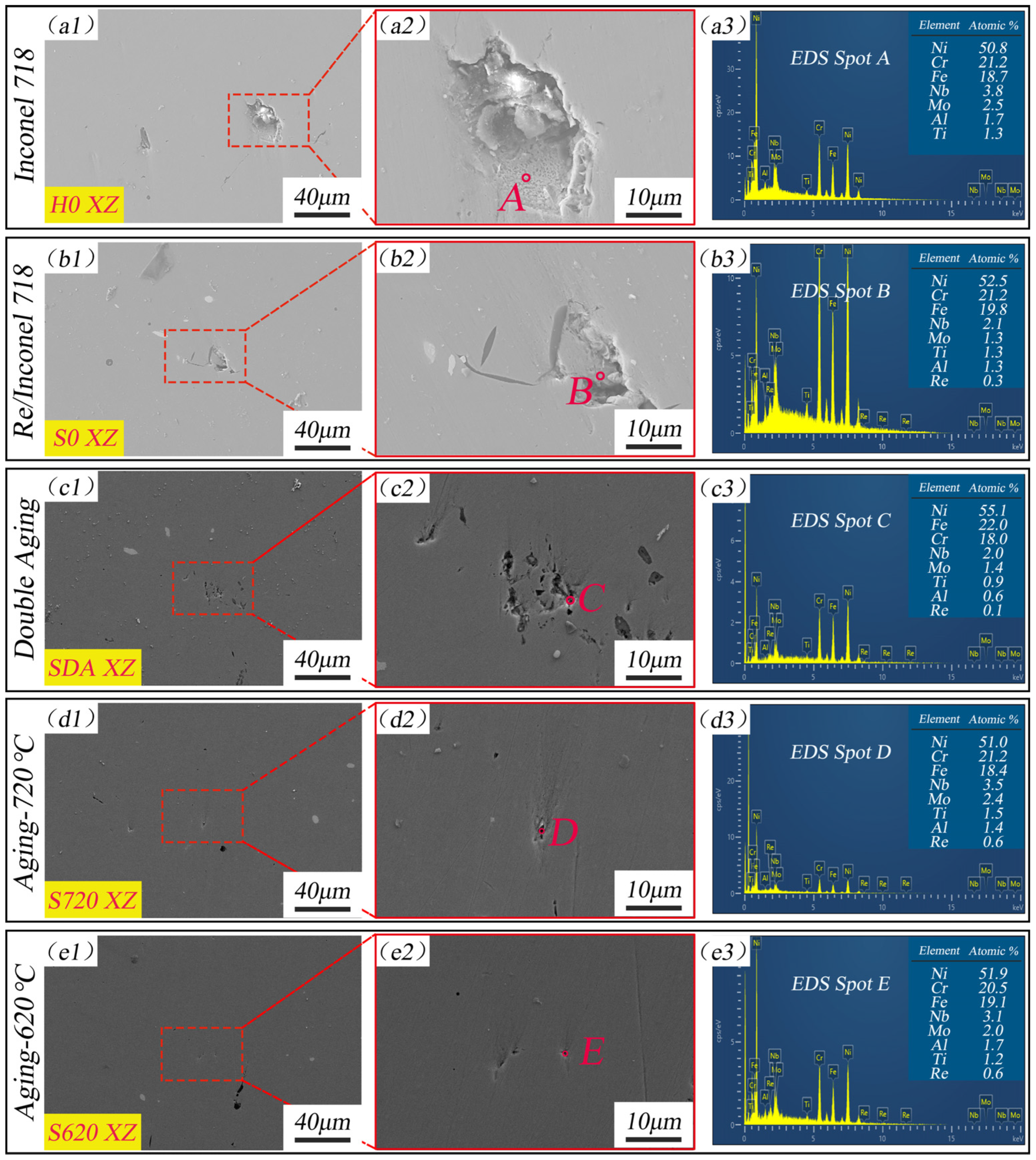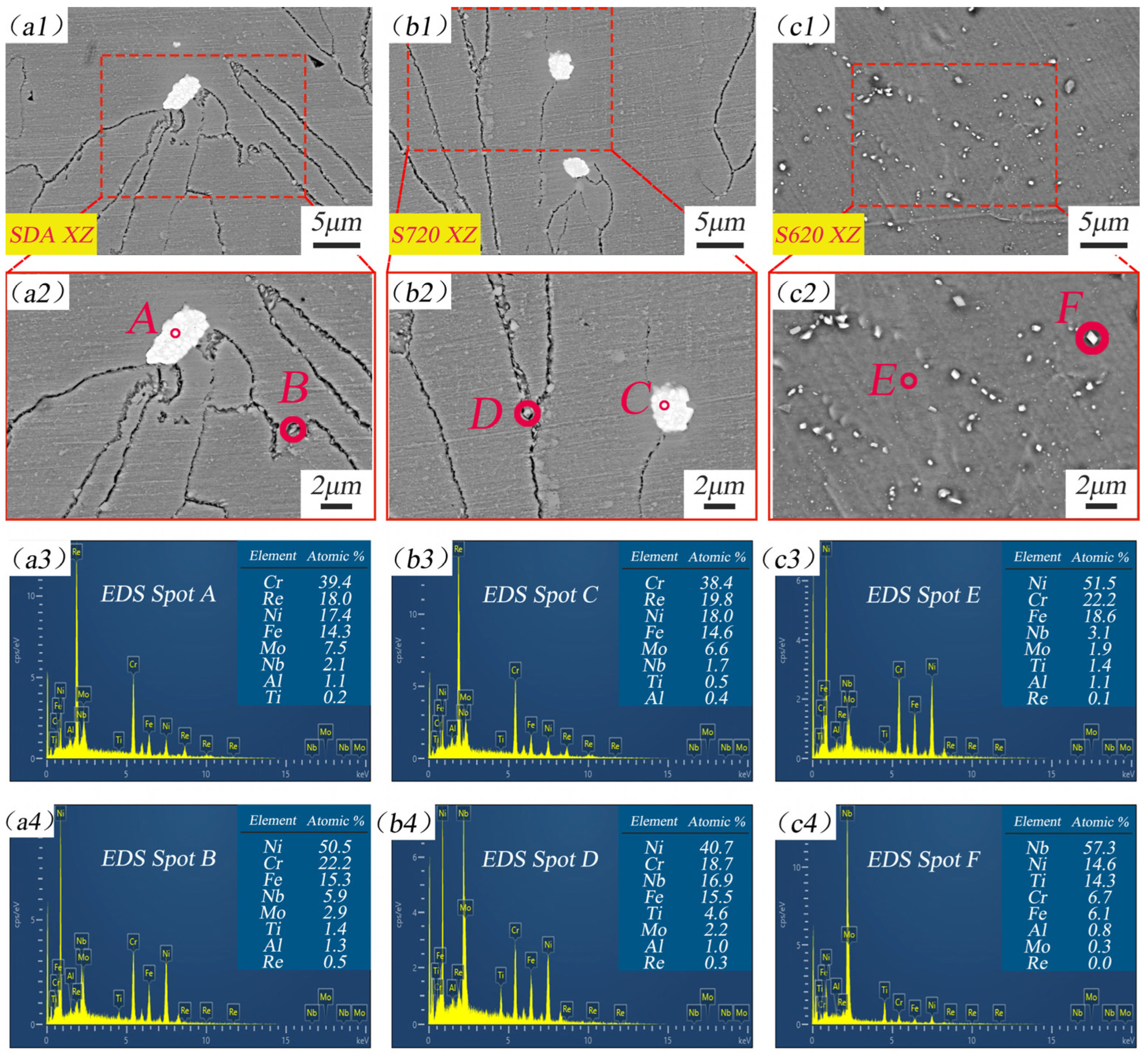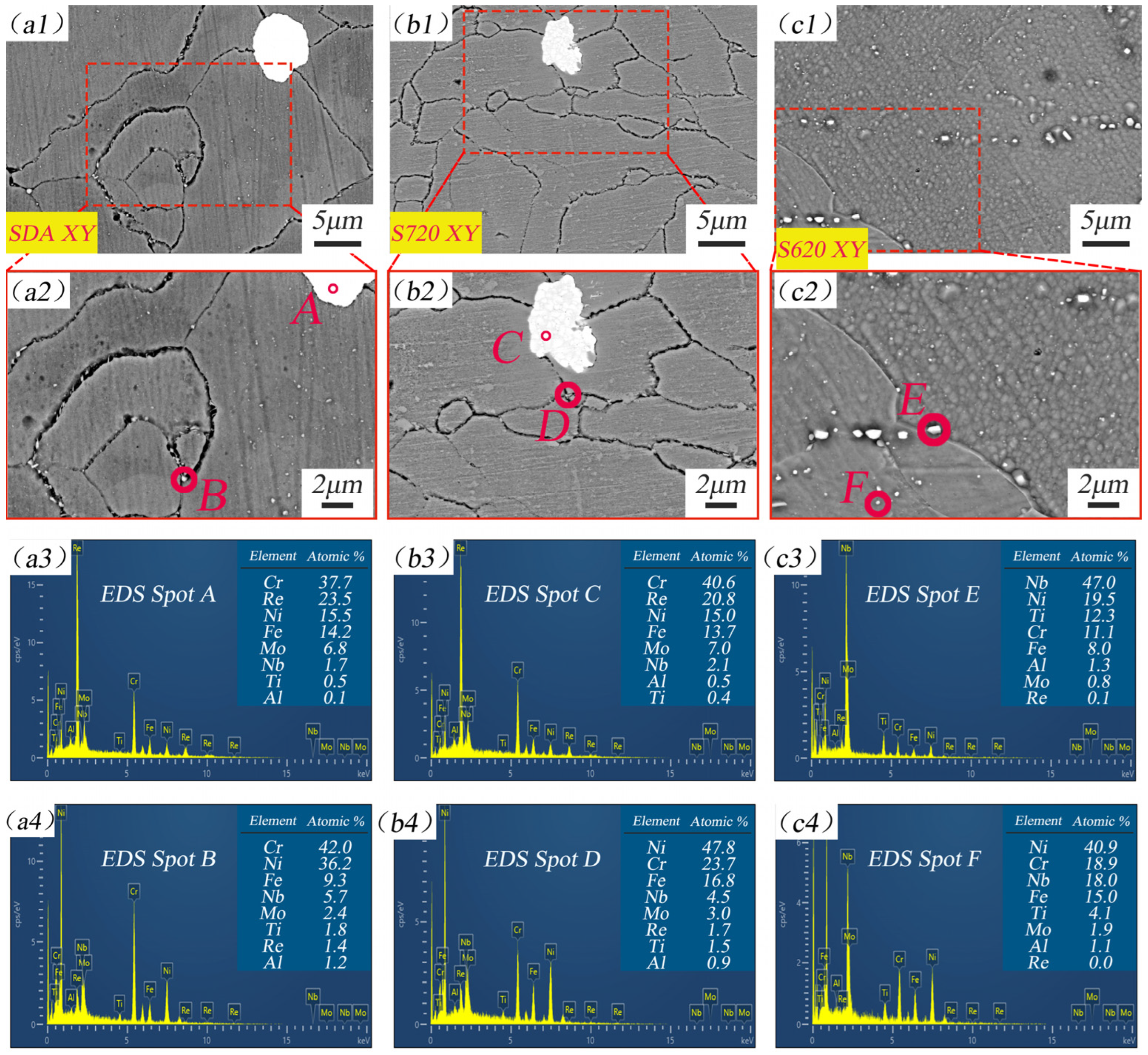 - After heat treatment, the sample undergoes recrystallization, accompanied by the precipitation of numerous fine strengthening phases. Simultaneously, a small number of particles within the grains are tentatively identified as undissolved NbC. The absence of the δ phase in the microstructure of the samples is attributed to the high solution temperature and segregation of the Re element. Furthermore, heat treatment promotes Re diffusion from locally enriched zones, leading to a pronounced reduction in the local Re concentration.