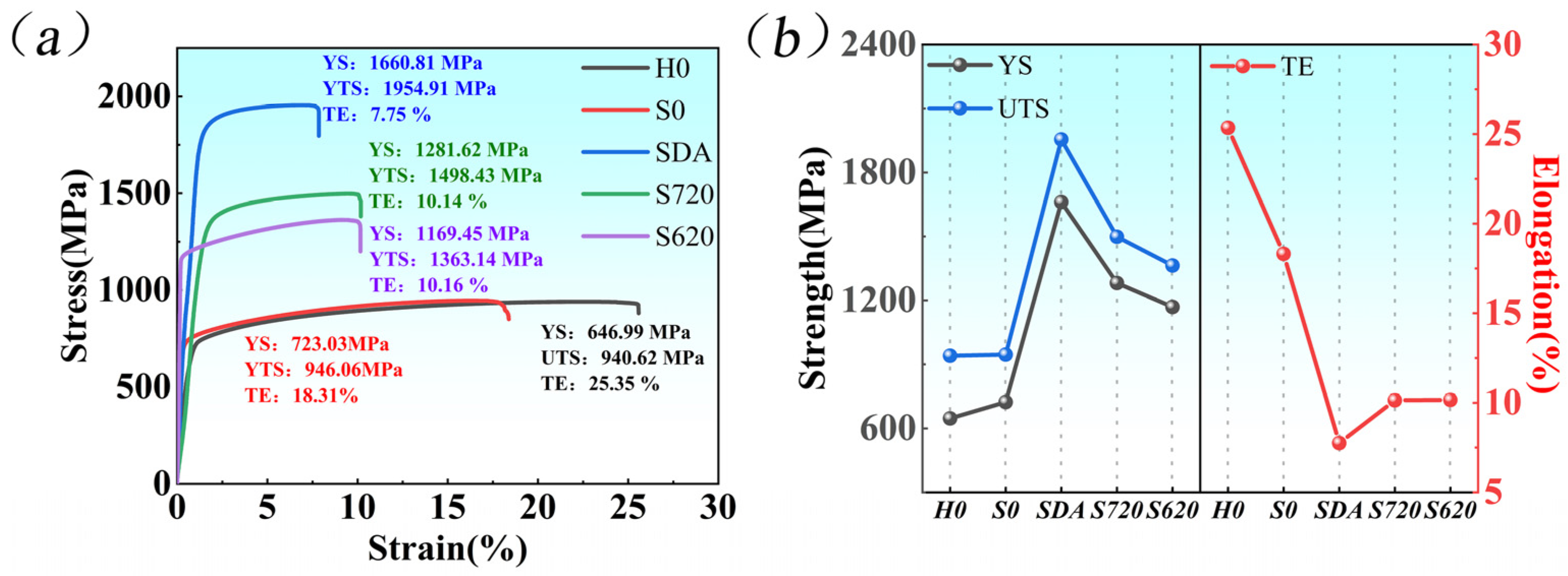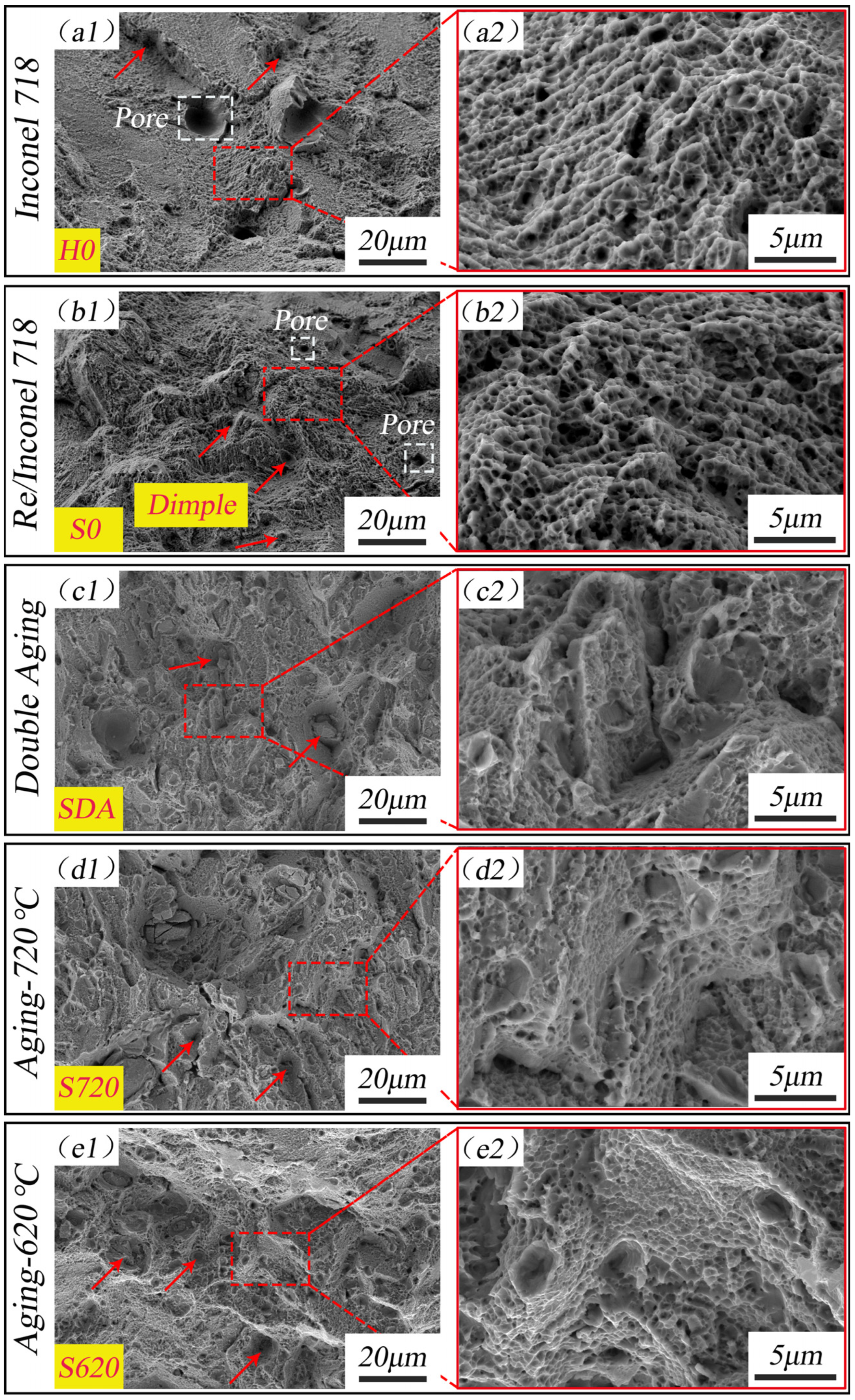 - The addition of Re improves the mechanical properties and corrosion resistance of the Inconel 718 alloy through synergistic strengthening mechanisms, including dispersion strengthening, solid solution strengthening, and dislocation strengthening. The aging treatment temperature of 720 °C × 8 h (FC × 2 h) + 620 °C × 8 h (AC) yields the optimum mechanical performance in the Re/Inconel 718 composites. The average microhardness (552 HV0.2), yield strength (1660.81 MPa), and ultimate tensile strength (1954.91 MPa) of the SDA sample increase simultaneously. The dissolution of Laves phases, simultaneous precipitation of both γ″ and γ′ phases and homogenization of the microstructure are responsible for the enhanced mechanical properties of the SDA sample.