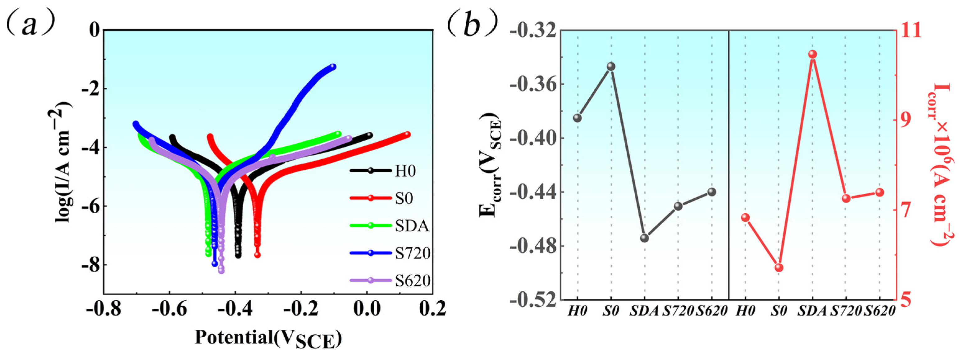 - The precipitation of abundant strengthening phases after heat treatment promotes the formation of numerous micro-galvanic cells, which accelerate the corrosion process and significantly degrade the material’s corrosion resistance. For the SDA sample, the double aging treatment at 720 °C × 8 h (FC × 2 h) + 620 °C × 8 h (AC) induces the simultaneous precipitation of γ″ and γ′ strengthening phases, leading to the highest micro-galvanic cell density. Consequently, the SDA sample exhibits the most rapid corrosion rate and the lowest corrosion resistance.