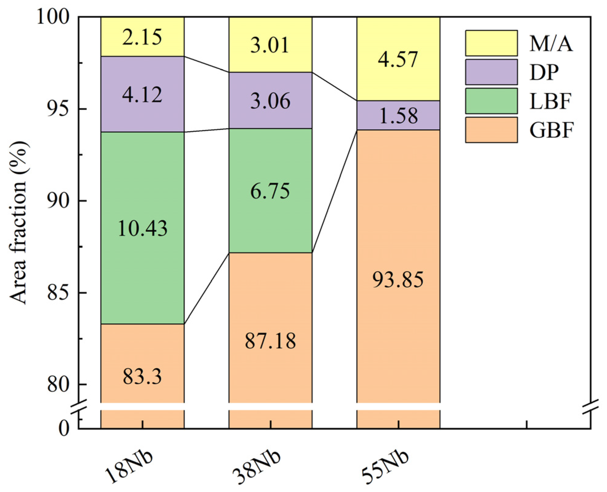 - As the Nb content increased, the area fractions of the GBF and M/A constituent increased in the CGHAZ, while those of the LBF and DP decreased. Concurrent with these alterations, the densities of both LAGBs and HAGBs increased, the MED from EBSD data decreased, and the PAGs refined.