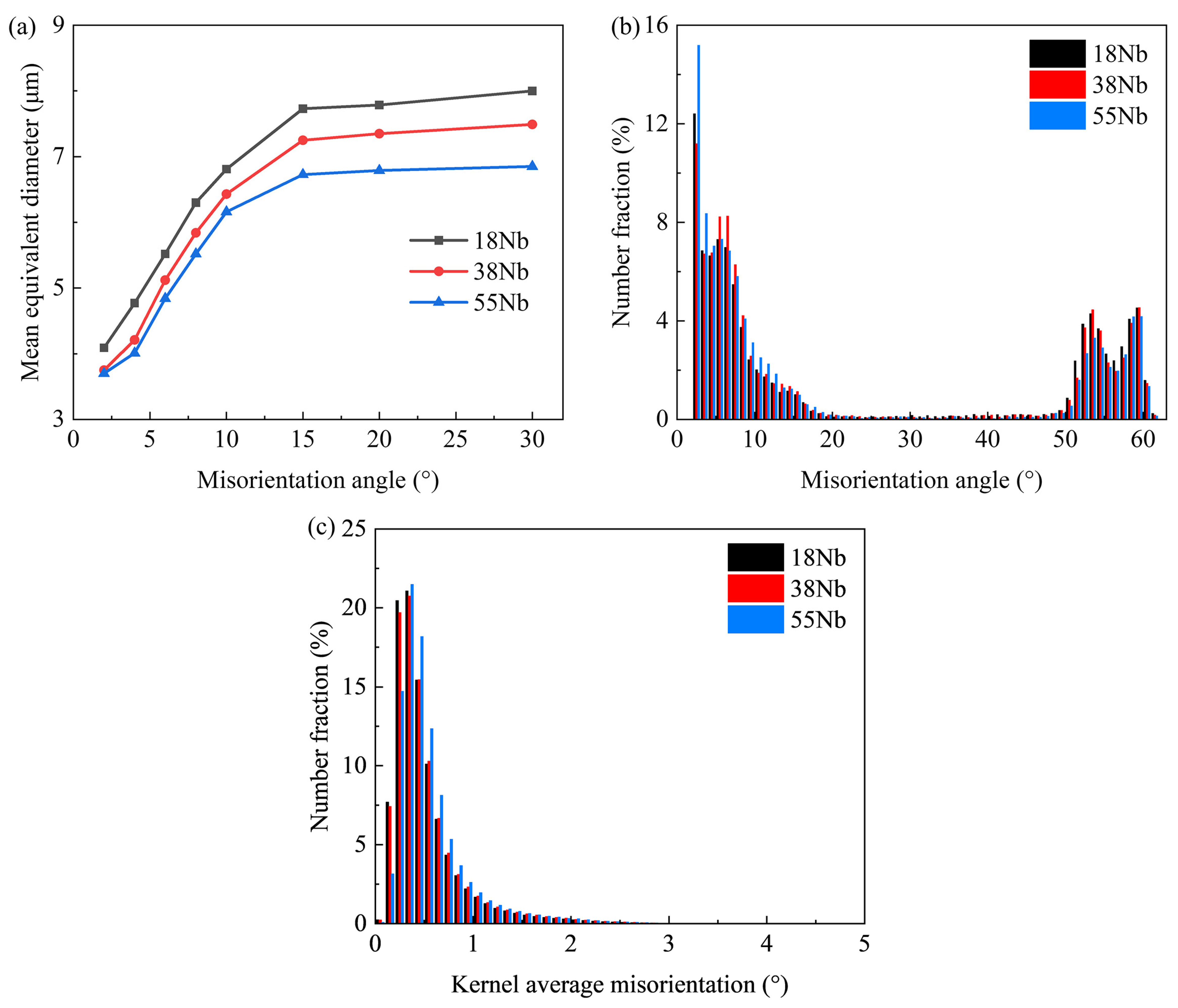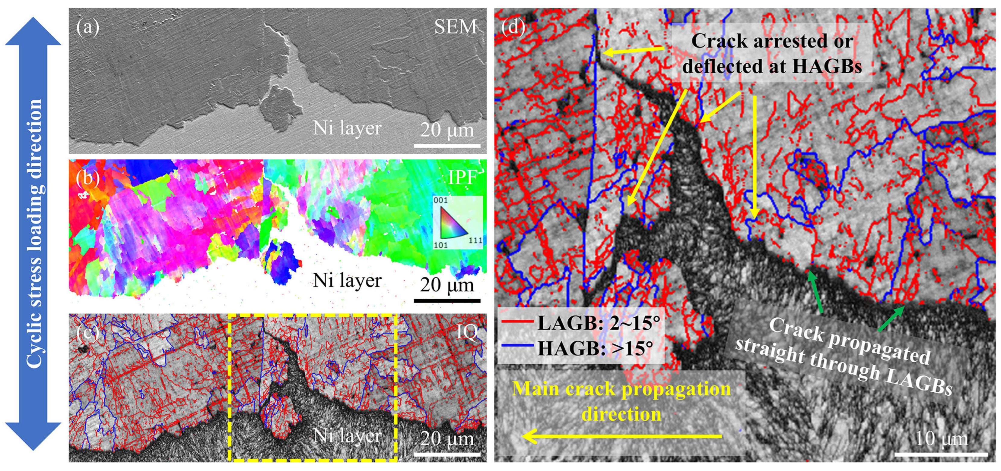 - HAGBs can deflect and arrest the fatigue secondary microcracks effectively. The enhanced density of HAGBs, concomitant with elevated Nb contents, has been demonstrated to directly augment the inhibitory effect of fatigue crack propagation.
