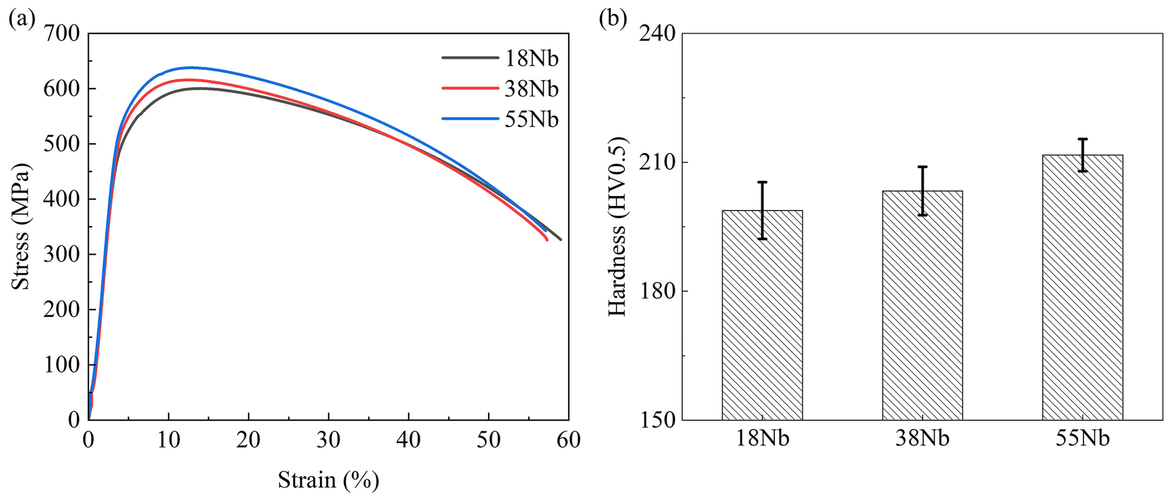 - The fatigue strength of the simulated CGHAZs exhibited an upward trend, increasing from 212.6 MPa to 231.9 MPa as the Nb content was augmented from 0.018 wt.% to 0.055 wt.%. In addition, the yield strength, tensile strength, and hardness of the CGHAZs exhibited a continuous increasing trend with increasing Nb content.
