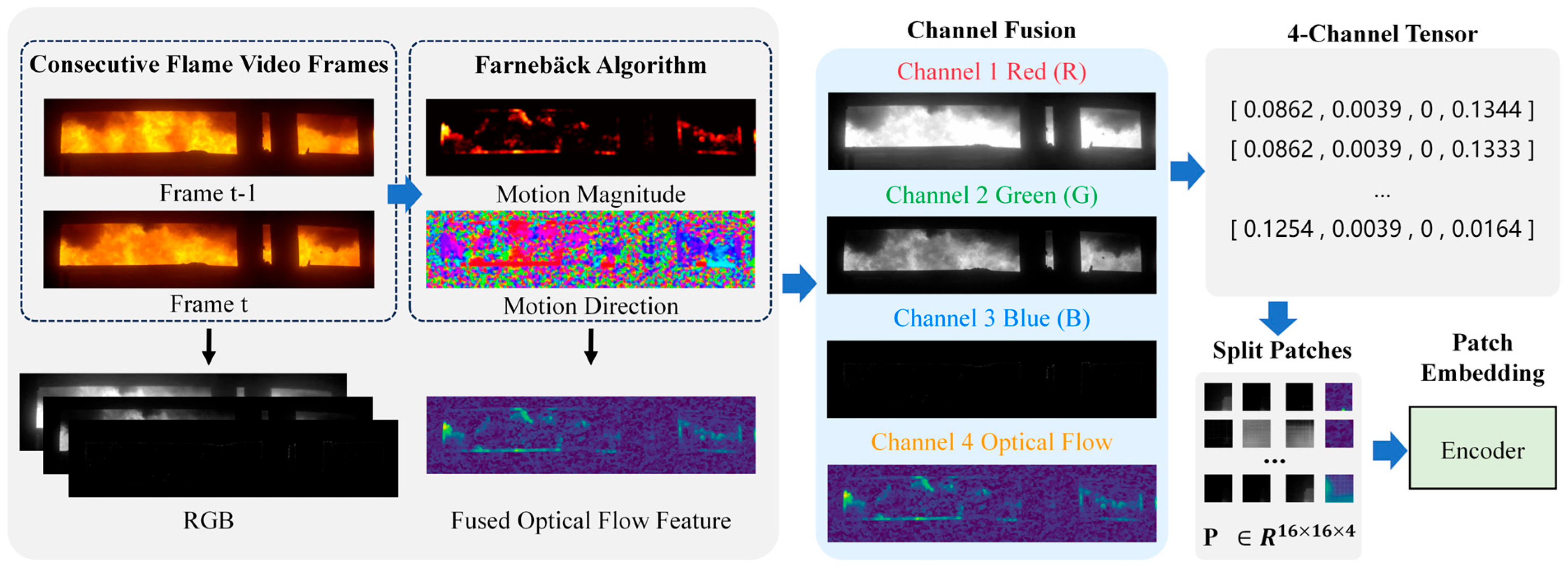 - This study proposes a data augmentation strategy by constructing four-channel input tensors combining RGB information with optical flow features. Incorporating optical flow characteristics enhances the model’s capability to capture dynamic flame motion patterns in steelmaking.