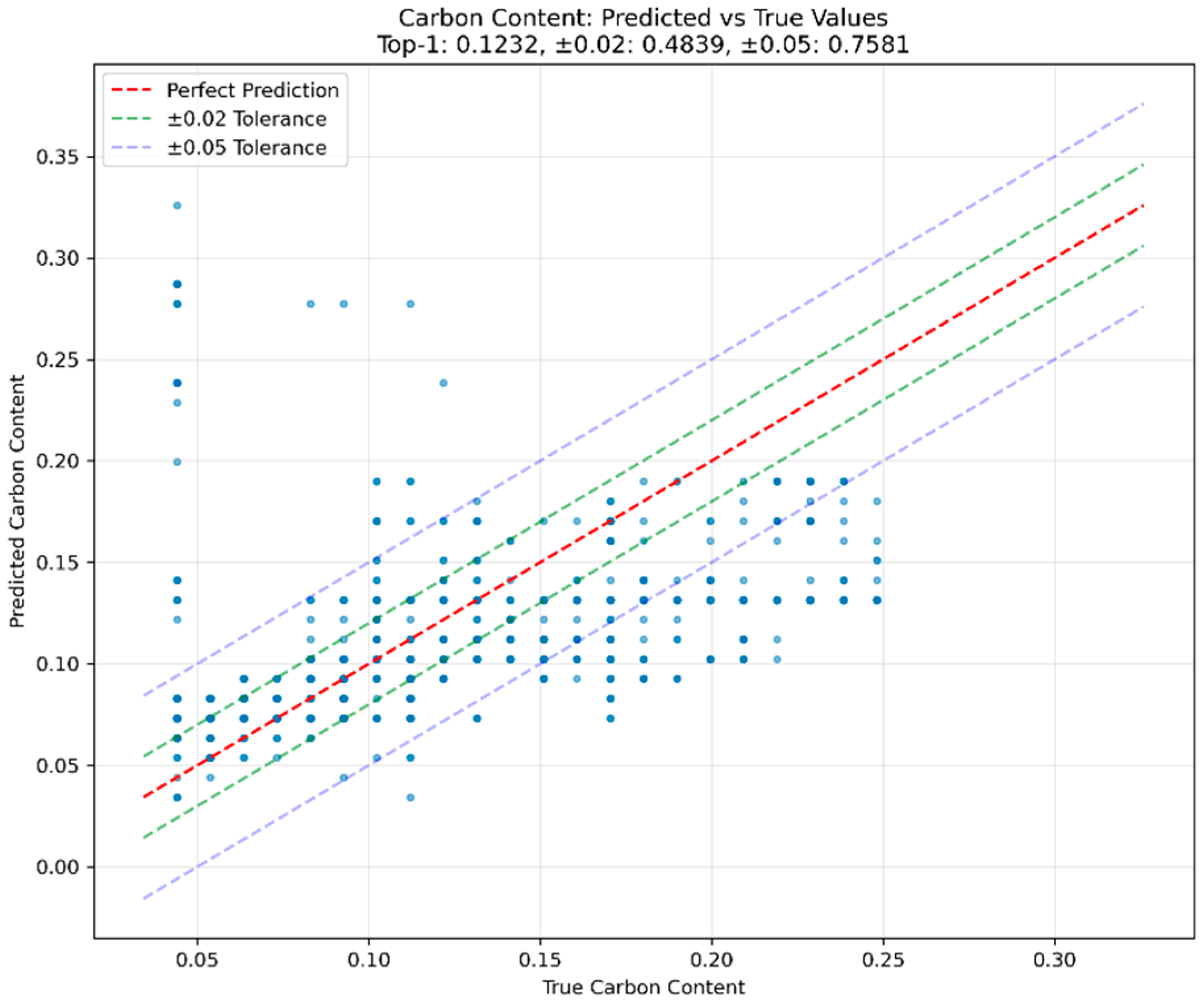 | Carbon Content Range | Precision | Recall | F1 Score | Samples |