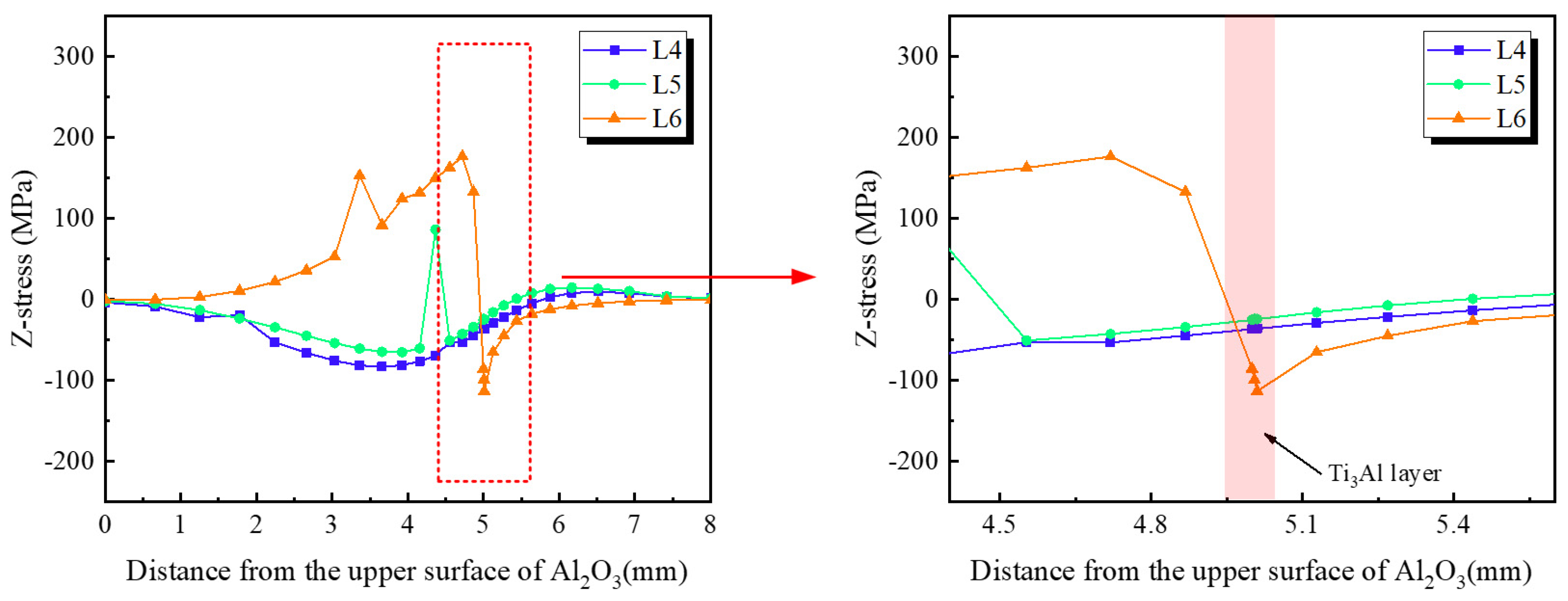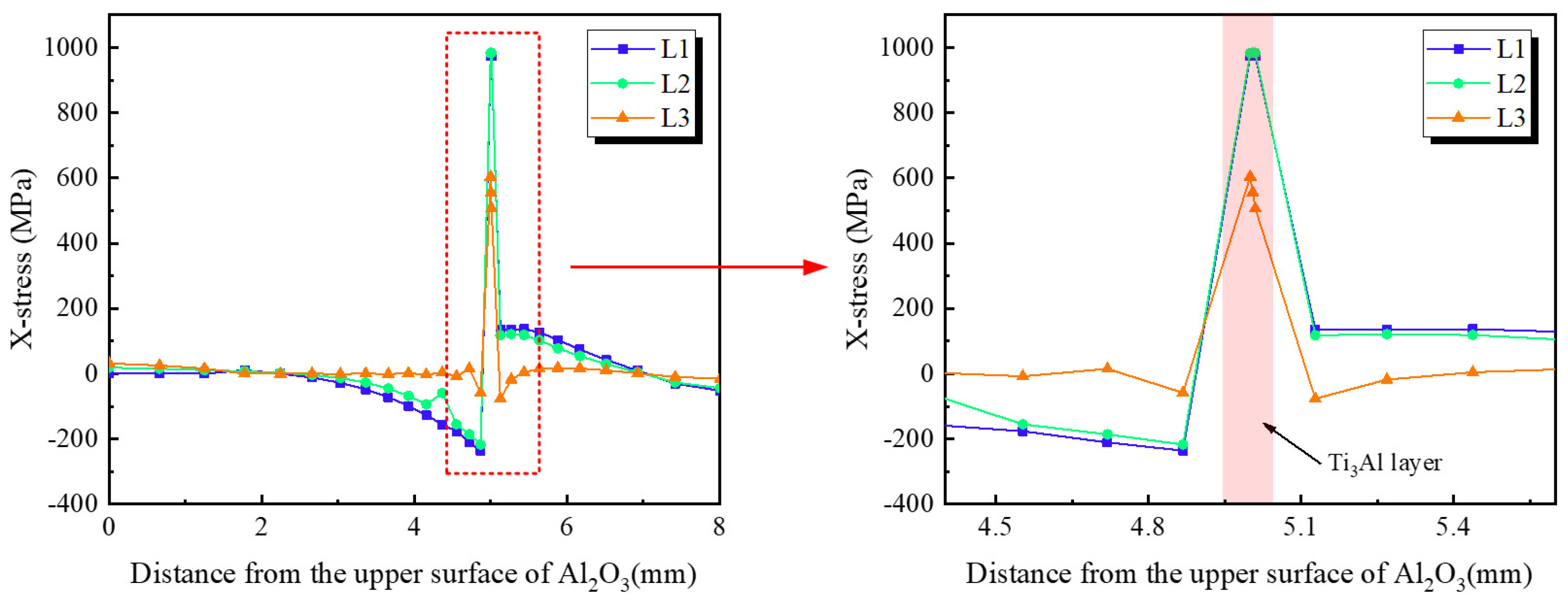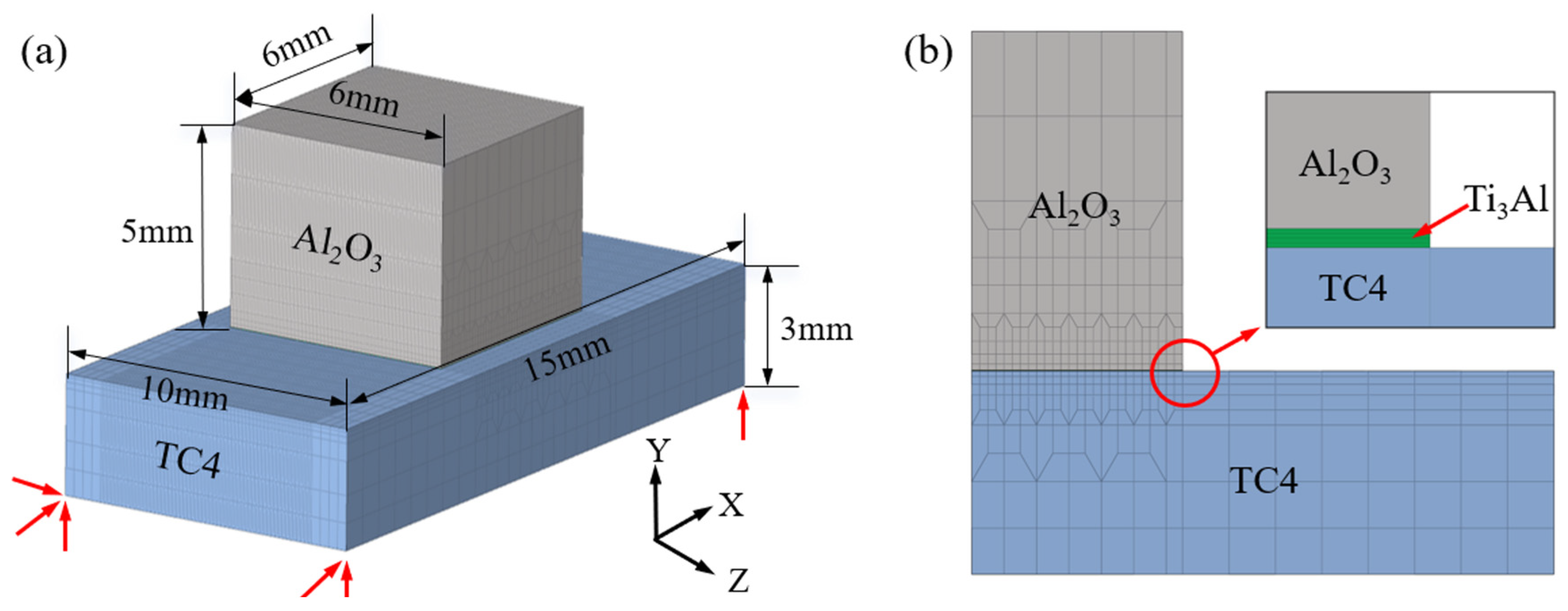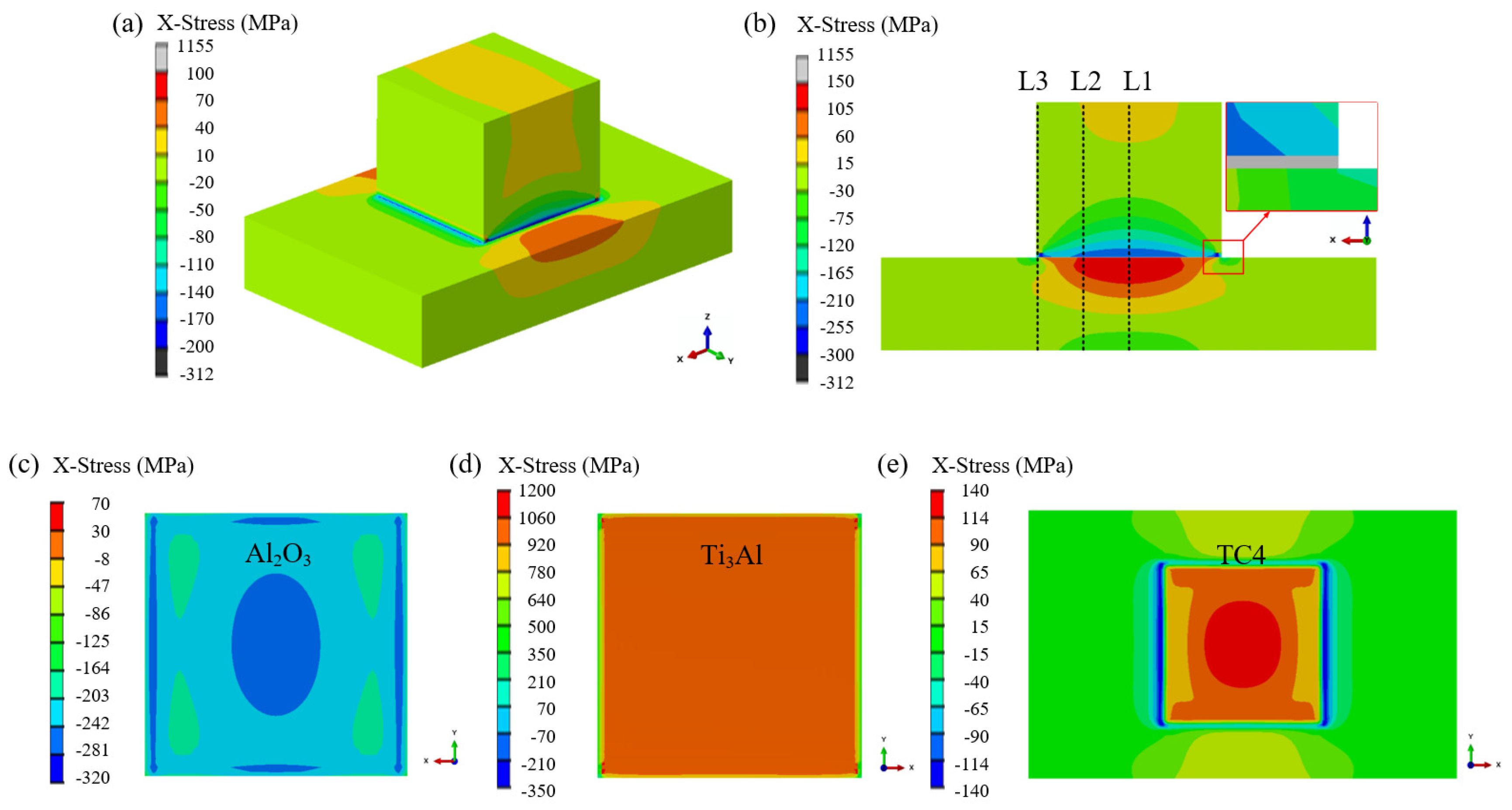 - Finite-element simulations confirm that residual stresses originate primarily from the CTE mismatch among Al2O3, Ti3Al, and TC4. The Ti3Al layer experiences the highest tensile stress in the X-direction (~980 MPa), whereas the Al2O3 ceramic near the interface is subjected to compressive stresses. In the Z-direction, tensile stress concentrations are localized along the vertical edges of the ceramic, representing potential sites for crack initiation during mechanical loading.