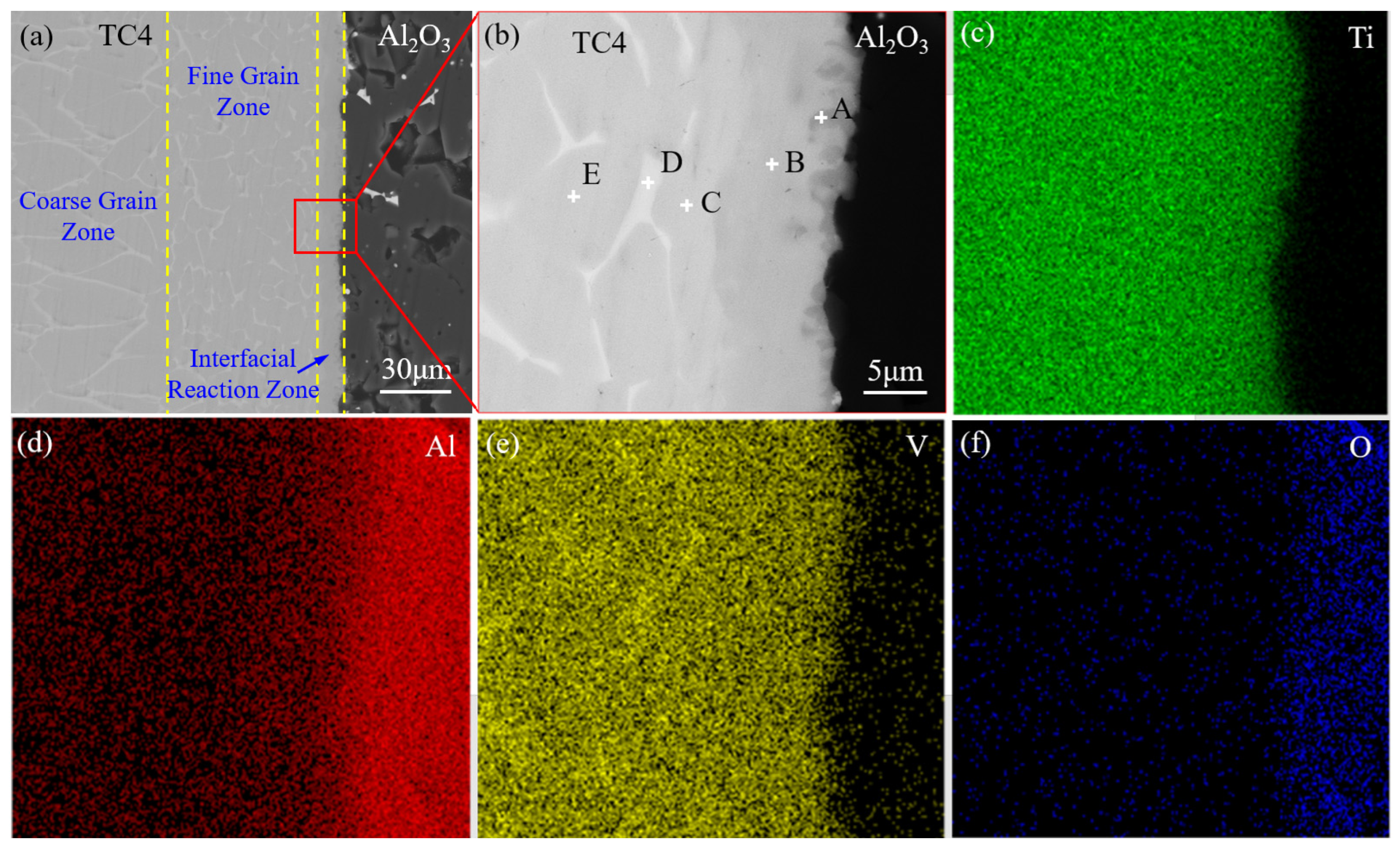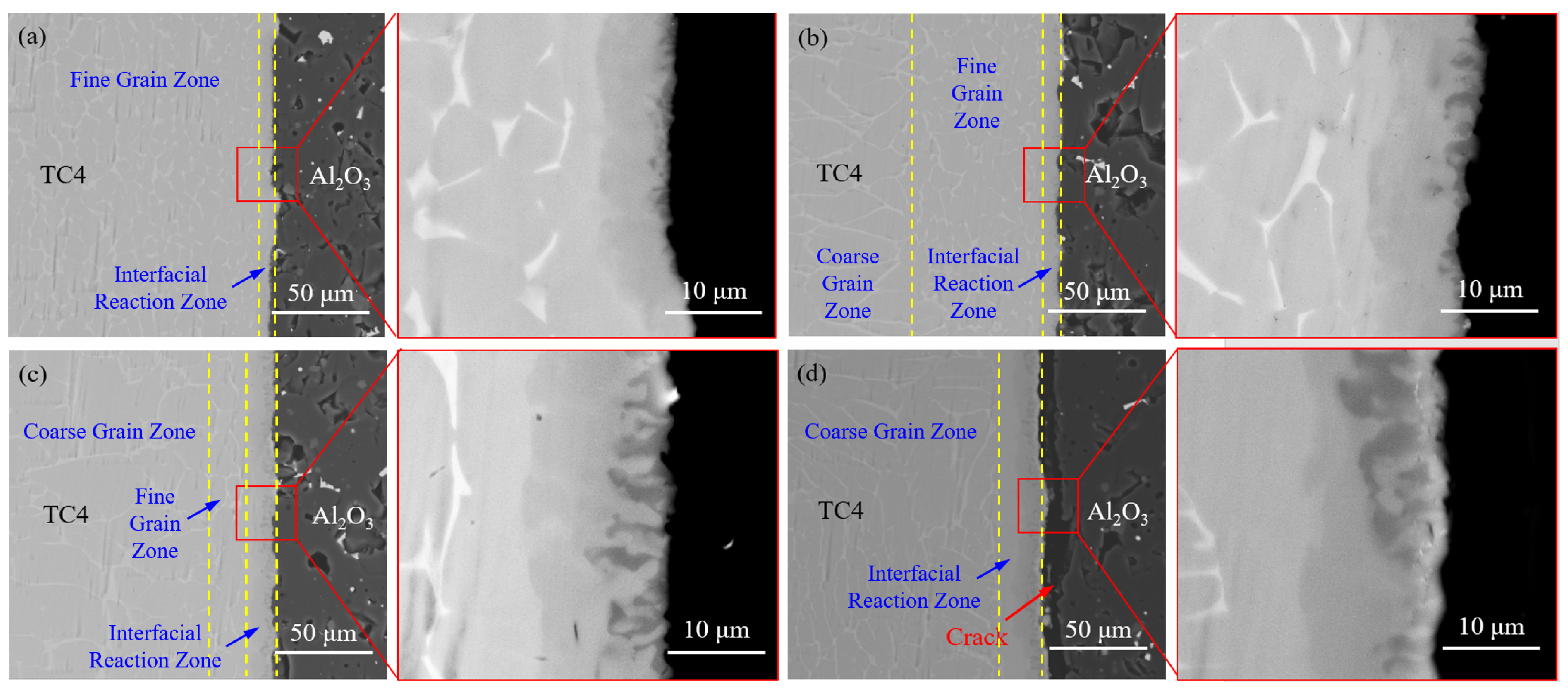 - Yang, Z.; Bai, Y.; Chen, H.; Li, Y. Interfacial Characteristics and Mechanical Properties of Al2O3 Ceramic/TC4 Alloy Joints Diffusion Bonded with an Aluminum Interlayer. Ceram. Int. 2025, 51, 64744–64758. [Google Scholar] [CrossRef]