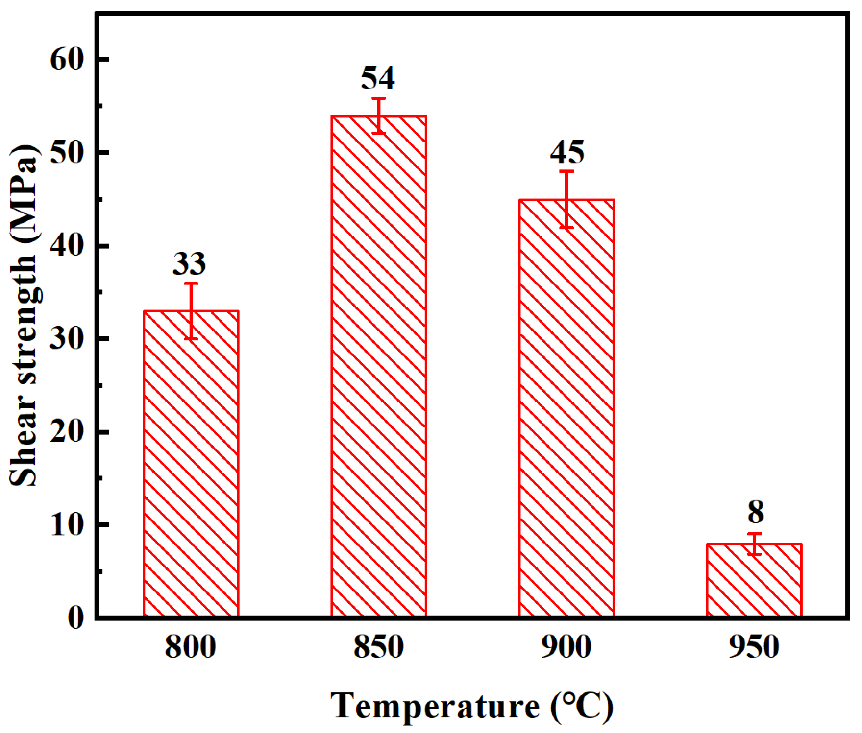 - The joint shear strength shows a strong dependence on bonding temperature, attaining a maximum value of 54 MPa at 850 °C. Beyond this temperature, excessive thickening of the brittle Ti3Al reaction layer leads to pronounced residual stresses and interfacial cracking, resulting in significant degradation of mechanical performance.