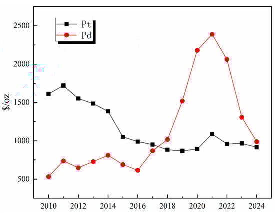 Global primary PGM resources are increasingly depleted, with approximately 70% of the reserves concentrated in countries such as South Africa and Russia. The distribution of global PGM reserves is shown in Figure 1. According to the 2024 report released by Anglo American, a South Africa-rooted global mining giant, the ore grade of its platinum mines has dropped from 4.5 g per ton in 2010 to 2.8 g per ton in 2024, while the mining costs have surged by 60% [1,2,3,4,5,6,7,8]. As the world’s largest consumer of PGMs, China has relatively low primary reserves and an extremely high degree of external dependence. Demand for PGMs remains robust globally in the context of green energy transition and industrial sectors, with an estimated annual growth rate maintaining a high level of 10–15%, particularly in key industries such as new energy vehicles, petrochemicals, and electronic information [9]. The growth rate of global demand for PGMs by industry from 2020 to 2024 is shown in Figure 2. This growth is particularly prominent in the petrochemical sector. In 2024, the massive commissioning of global catalytic reforming units—with the estimated new capacity reaching around 12 million tons per year—has directly driven an annual increase of approximately 15 tons in the demand for palladium [10]. Currently, the global recycling level of PGMs is far from meeting the consumption scale of primary mineral resources, with the recovery rate remaining at a low level for a long time. The supply capacity of secondary resources is limited, which has exacerbated the structural shortage in the market. Among various secondary resources, spent automotive exhaust catalysts are the most important contributors in the recycling value chain, forming the absolute source of recycled PGMs. Driven by this supply–demand fundamental, the international spot prices and domestic recycling prices of metals such as platinum and palladium have both shown characteristics of operating at high levels with significant fluctuations in recent years [11,12,13]. The trend of international spot prices of Pt/Pd from 2010 to 2024 is shown in Figure 3. This profoundly reflects their irreplaceable scarcity and high economic value in key application fields.