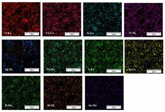 This study focuses on two core categories of secondary resources. The first category is metallurgical by-products, represented by copper/lead smelting anode slime, stainless steel pickling sludge, and precious metal refining slag. The typical composition of copper anode slime, expressed as a mass fraction, is as follows: Cu 5–15%, Pb 10–25%, Se 2–8%, Te 0.5–3%, Au 0.02–0.05%, Ag 0.5–0.8%, Pt 0.0005–0.002%, and Pd 0.001–0.003% [18,19,20,21,22]. Zhou et al. [23] systematically studied the leaching behavior of rare and precious metals such as Te, Au, Pt, and Pd and base metals such as Pb, Sn, Sb, and Ag in decoppered anode slime through electron probe microanalysis, thermodynamic analysis, and leaching experiments. The occurrence state and embedding characteristics of metals are revealed. Among them, metals Te, Au, Pt and Pd are mostly distributed on the surface of particles, high specific surface areas or metal alloy phases, while metals Sn, Sb, Ag, Ba and some Pb exist in sulfate blocks, oxide rod-like particles or stable shells, which are difficult to dissolve in the leaching process and thus remain in the slag. Figure 4 shows the distribution of main elements in copper anode slime. Copper and tellurium are evenly distributed in the raw materials. To further clarify the occurrence state and content of metals, the main mineral phases in the raw materials were determined by chemical phase analysis. The results show that Cu mainly exists in the form of CuO, CuSO4 and CuS. Te mainly exists in the form of elemental Te and AuTe2. Pb, Bi and Ag are dominated by PbSO3, Bi2O3 and Ag2S, respectively [24]. The carrier of automotive TWCs is cordierite, with γ-Al2O3 coated on its surface, and PGMs are supported on the γ-Al2O3 surface in the form of nanoparticles—there is a strong interaction between the active components and the carrier. In petrochemical hydrogenation catalysts, Pt is dispersed as single atoms in the pores of γ-Al2O3, while it reforms an alloy with Pt in the form of Re2O7 [25,26,27,28,29].