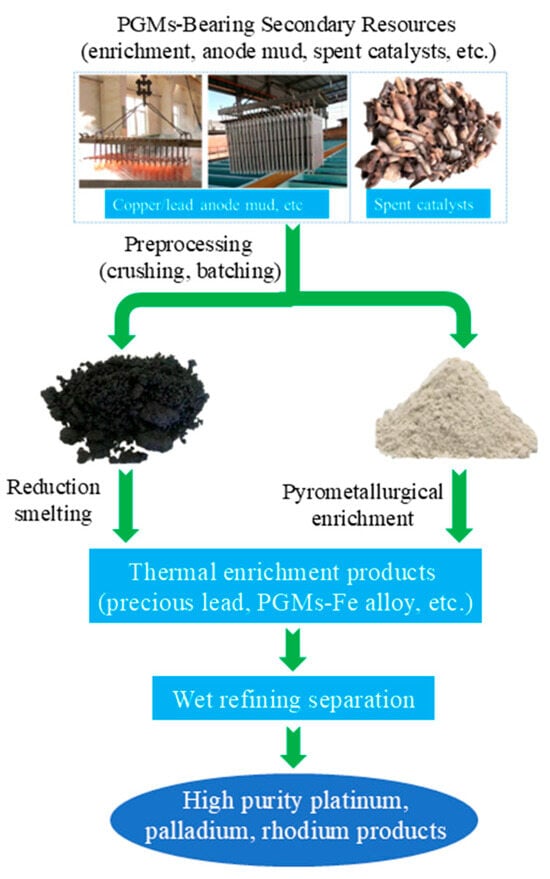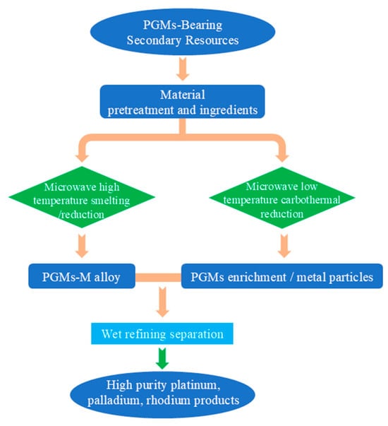 Platinum group metals (PGMs)—comprising platinum (Pt), palladium (Pd), rhodium (Rh), iridium (Ir), ruthenium (Ru), and osmium (Os)—are indispensable strategic materials for key industries, including automotive manufacturing, petrochemical engineering, and the new energy sector. Given the uneven global distribution of primary PGM reserves and the widening supply–demand gap, recovering PGMs from secondary sources—primarily metallurgical by-products and spent catalysts—has become a strategic priority. synergistic smelting, leveraging “multi-feedstock complementarity” and “multi-technology coupling,” offers an efficient approach to overcoming challenges associated with secondary resources, such as low grades, complex matrices, and refractory separation. This paper systematically reviews the technological evolution of synergistic smelting for PGMs recovery, focusing on three aspects: the characteristics and processing bottlenecks of PGMs-bearing secondary resources, the development trajectory of traditional metallurgical technologies, and innovative breakthroughs in microwave-assisted synergistic smelting. A comparative analysis between traditional and microwave-based technologies is conducted across four dimensions: resource adaptability, technical performance, environmental sustainability, and industrial maturity. Finally, the core challenges currently confronting microwave-assisted synergistic smelting and future directions for industrial demonstration are elaborated on. This study serves as a comprehensive reference for the efficient and sustainable recovery of PGMs, with significant implications for the circular economy and strategic resource security.