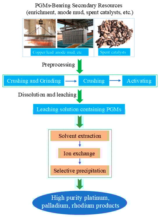 Against the backdrop of increasingly tight primary mineral resources, secondary resources represented by metallurgical by-products (such as copper anode slime, stainless steel pickling sludge, and precious metal refining slag) and various spent catalysts (such as automotive three-way catalysts and petrochemical hydrogenation catalysts) have been widely recognized as the most valuable strategic resource reserve, due to their high enrichment of PGMs and large potential reserves [14,15]. Compared with low-grade primary ores, the grade of PGMs in these secondary resources is usually several orders of magnitude higher, demonstrating extremely high recycling economics. For instance, the contents of metals such as Pt and Re in spent petrochemical catalysts are quite considerable. Meanwhile, end-of-life automotive exhaust catalysts have become the most important urban mineral source of metals like Pt, Pd, and Rh in the circular economy. Among metallurgical by-products, copper anode slime is particularly significant—it is not only the main raw material for Ag and Au recovery but also contains a notable grade of PGMs, serving as a stable and reliable secondary supply source for these rare and precious metals [16,17].