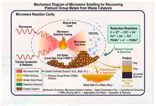 Figure 9 illustrates the mechanism of recovering platinum group metals (PGMs) from spent catalysts via microwave smelting. This schematic demonstrates the core mechanism of microwave-assisted smelting for PGMs recovery: within the microwave reaction cavity, microwaves selectively heat catalyst particles supported on carriers such as alumina and magnesia, generating localized “hot spots” with temperatures exceeding 1500 °C. Heat further propagates through conduction and radiation, triggering a carbothermal reduction reaction. Carbon acts as a reductant, undergoing oxidation and releasing electrons that subsequently reduce iron ions and PGM ions to their metallic states. The reduced PGMs then migrate into the molten iron phase, forming an iron–PGM alloy melt, thereby achieving enrichment and agglomeration. Ultimately, phase separation occurs within the system, resulting in a slag layer composed of oxidized carrier materials, a PGM-enriched alloy layer, and a layer of unreacted materials, thus accomplishing the separation and recovery of PGMs.