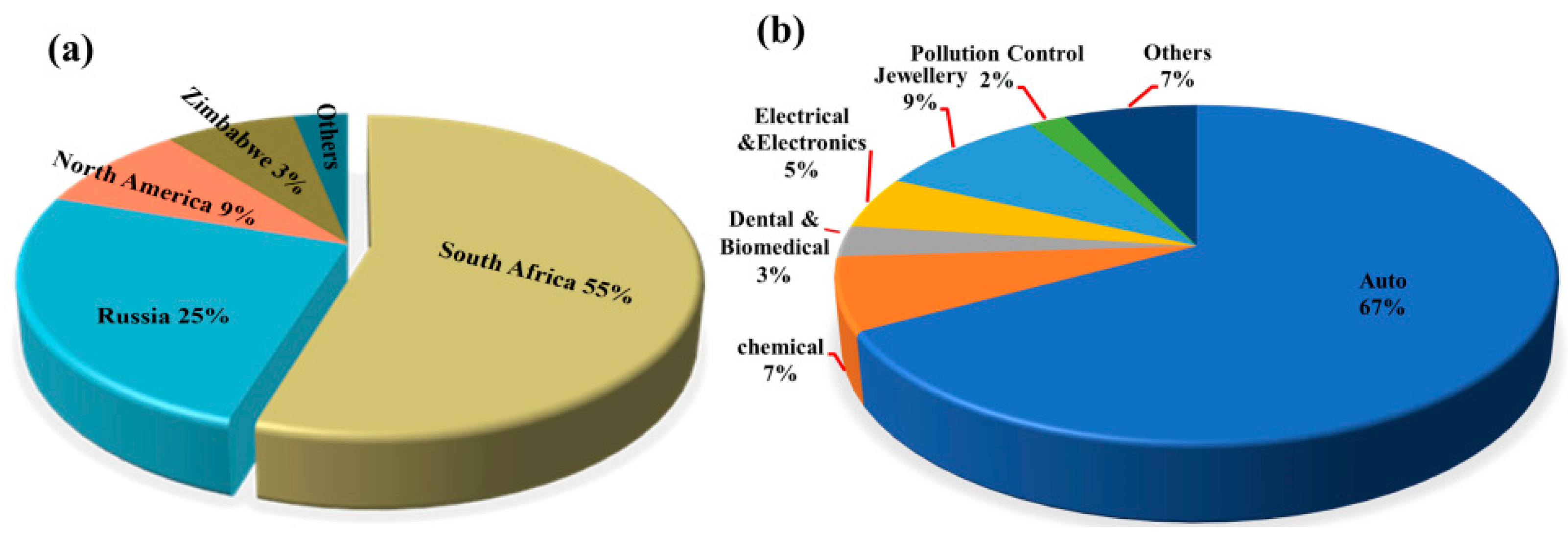 - Hughes, A.E.; Haque, N.; Northey, S.A.; Giddey, S. Platinum Group Metals: A Review of Resources, Production and Usage with a Focus on Catalysts. Resources 2021, 10, 93. [Google Scholar] [CrossRef]