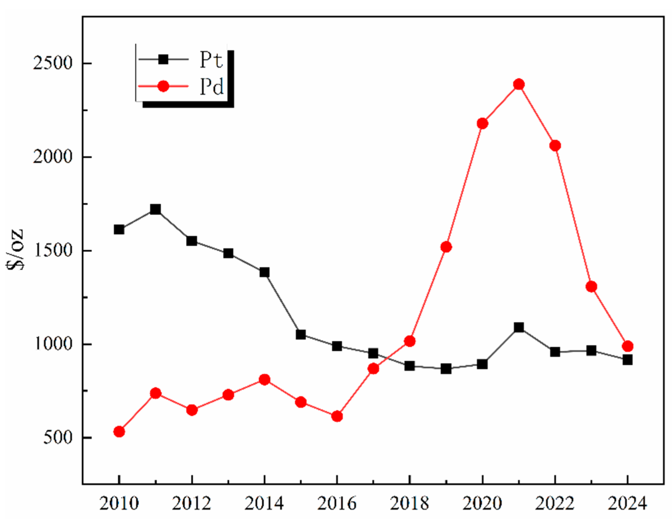 - Qiao, J.; Chen, A.; Guo, X.; Li, D.; Lin, J. Recovery of Platinum Group Metals from Spent Automobile Exhaust Catalysts. JOM 2024, 76, 750–758. [Google Scholar] [CrossRef]
