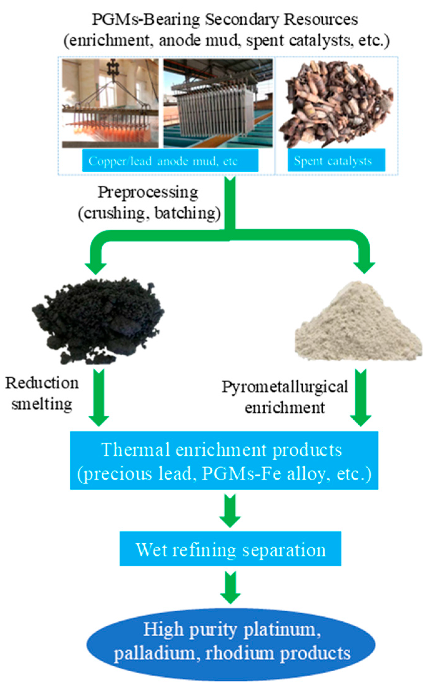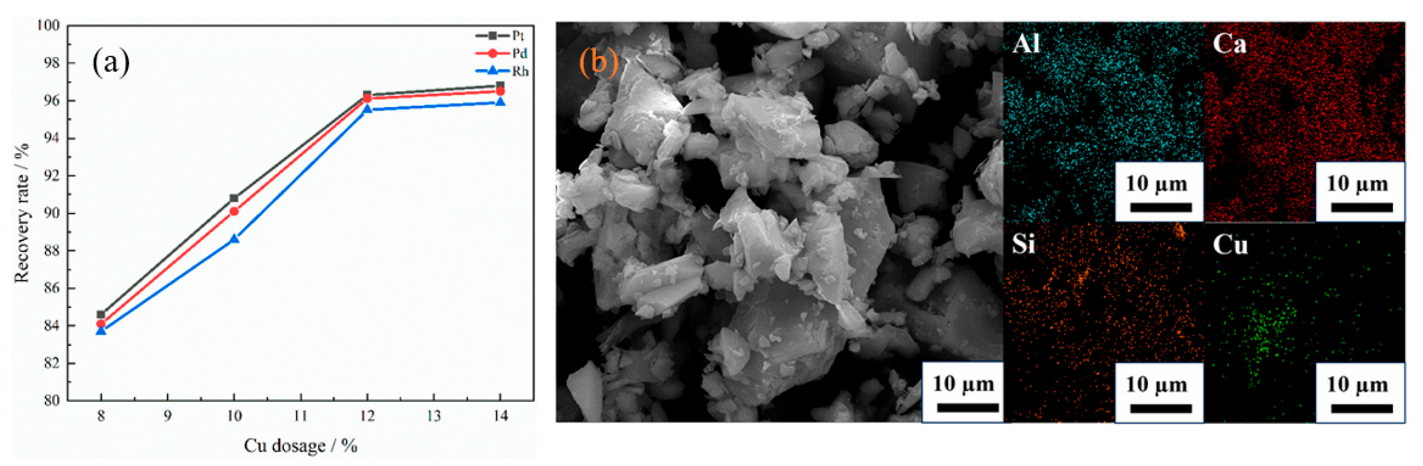 - Zheng, H.; Ding, Y.; Wen, Q.; Zhao, S.; He, X.; Zhang, S.; Dong, C. Slag design and iron capture mechanism for recovering low-grade Pt, Pd, and Rh from leaching residue of spent auto-exhaust catalysts. Sci. Total Environ. 2022, 802, 149830. [Google Scholar] [CrossRef]