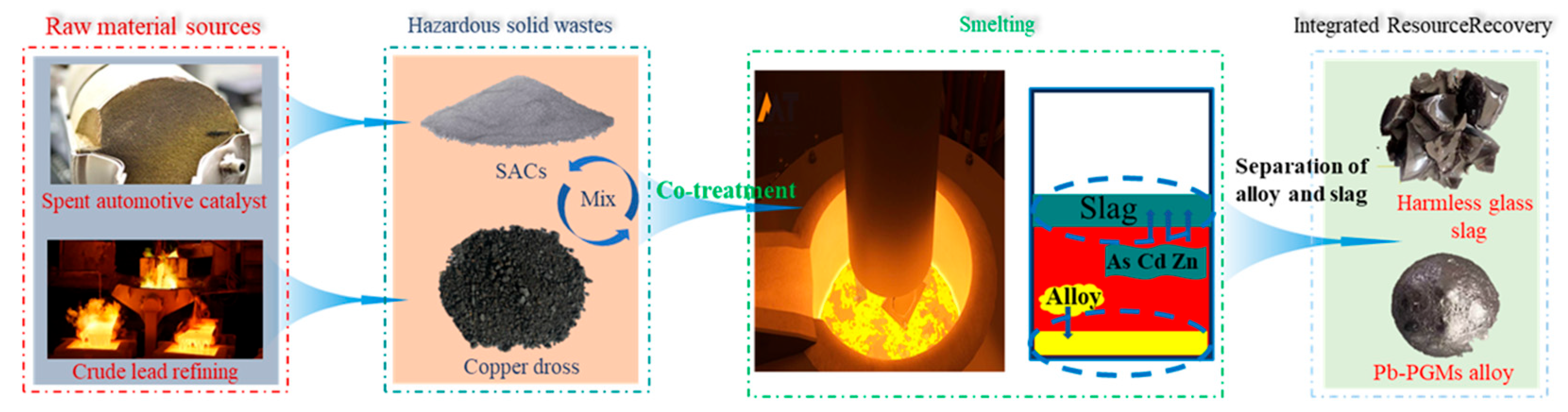 - Chen, S.; Song, Q.; Xu, Z. Mechanism of PGMs capture from spent automobile catalyst by copper from waste printed circuit boards with simultaneous pollutants transformation. Waste Manag. 2024, 186, 130–140. [Google Scholar] [CrossRef]