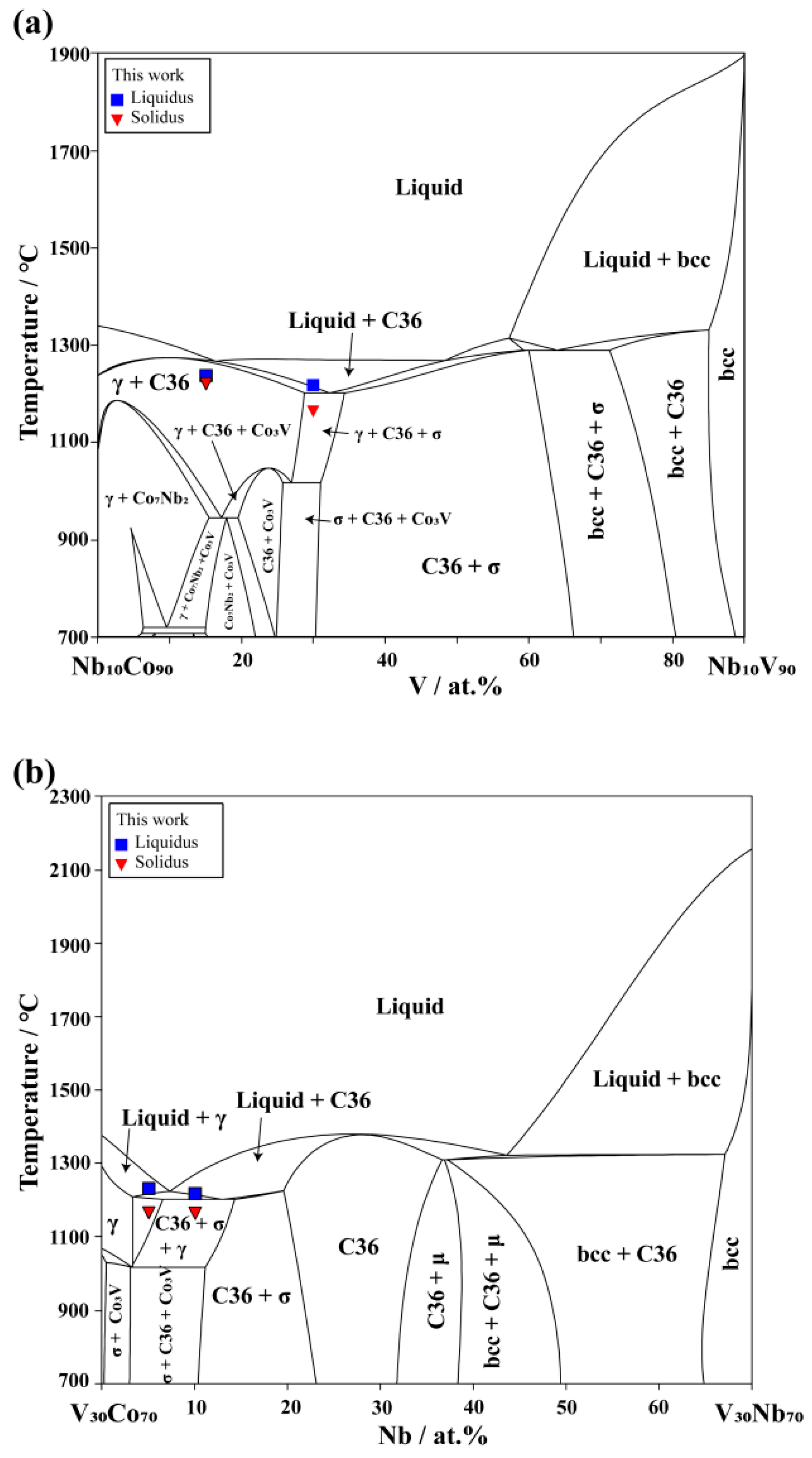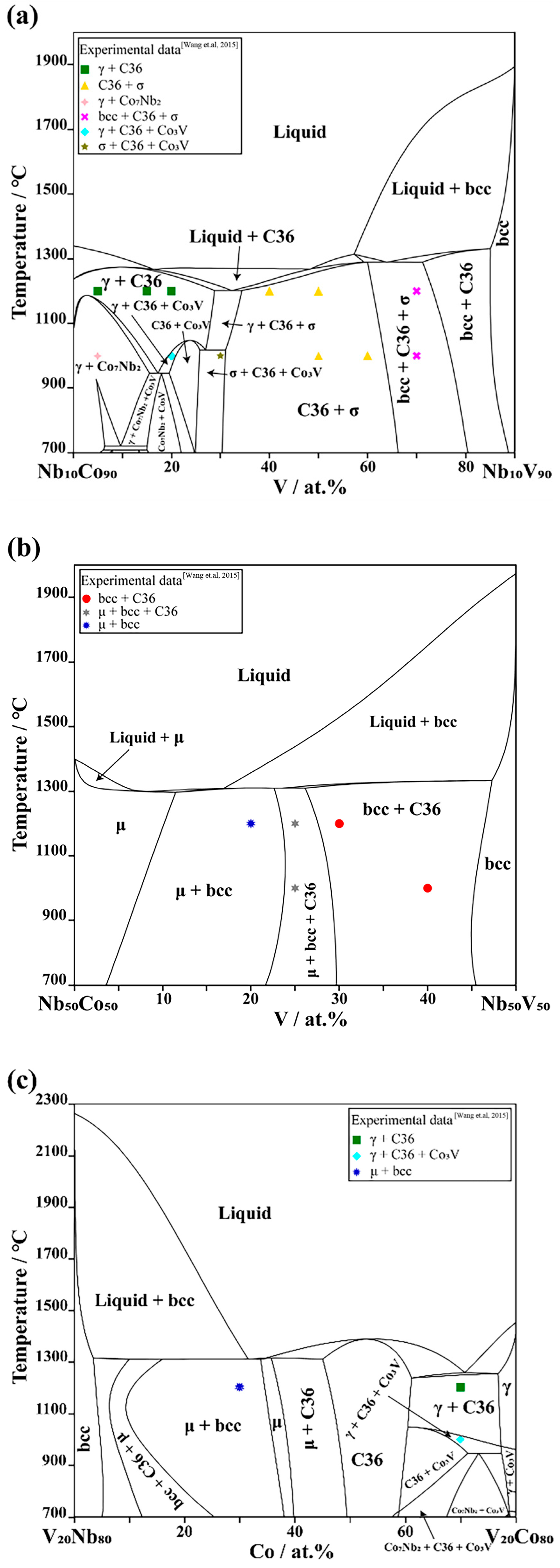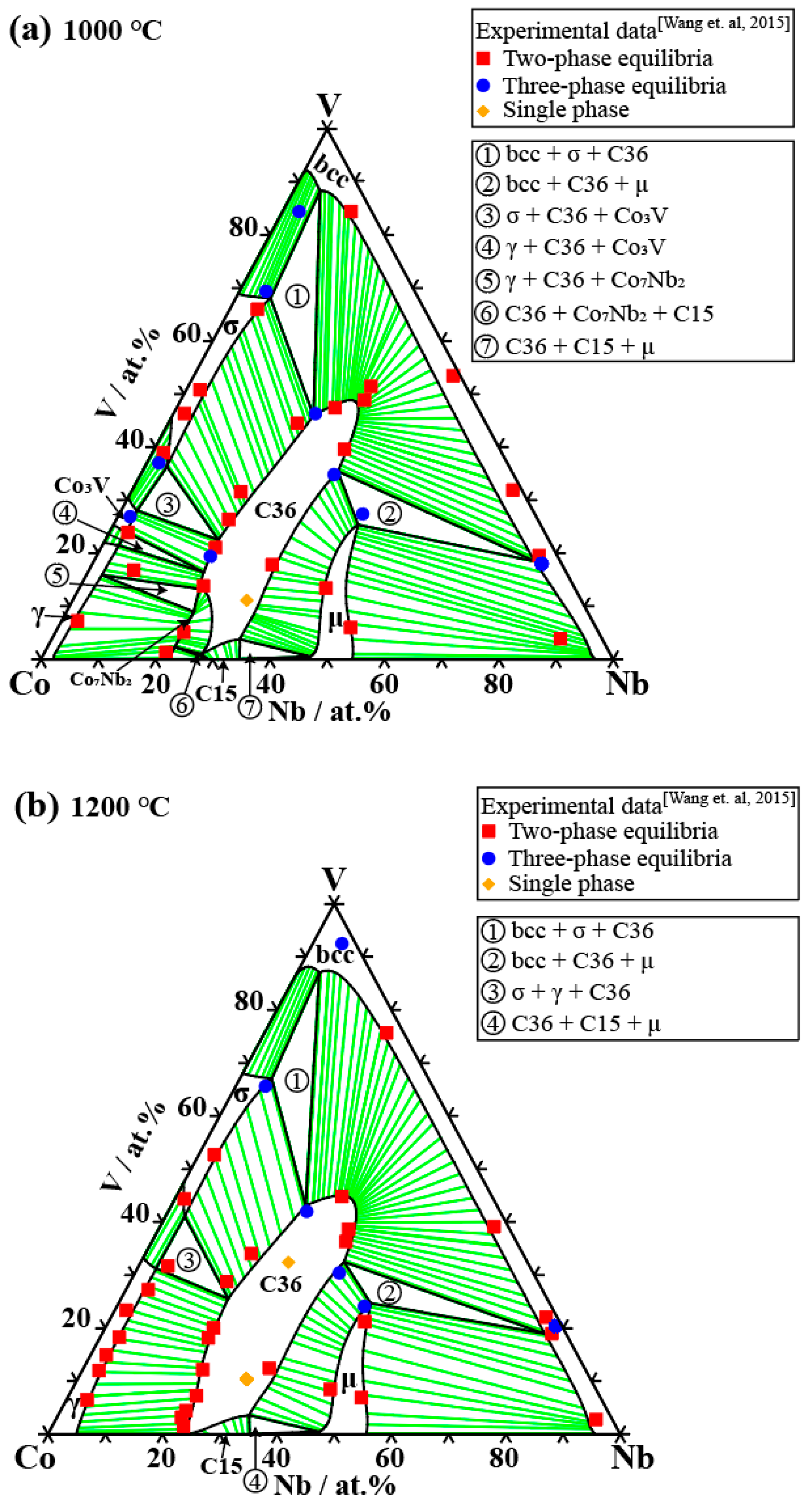 - Wang, C.P.; Yang, S.; Yang, S.Y.; Wang, D.; Ruan, J.J.; Li, J.; Liu, X.J. Experimental investigation of the phase equilibria in the Co-Nb-V ternary system. J. Phase Equilibria Diffus. 2015, 36, 592–598. [Google Scholar] [CrossRef]