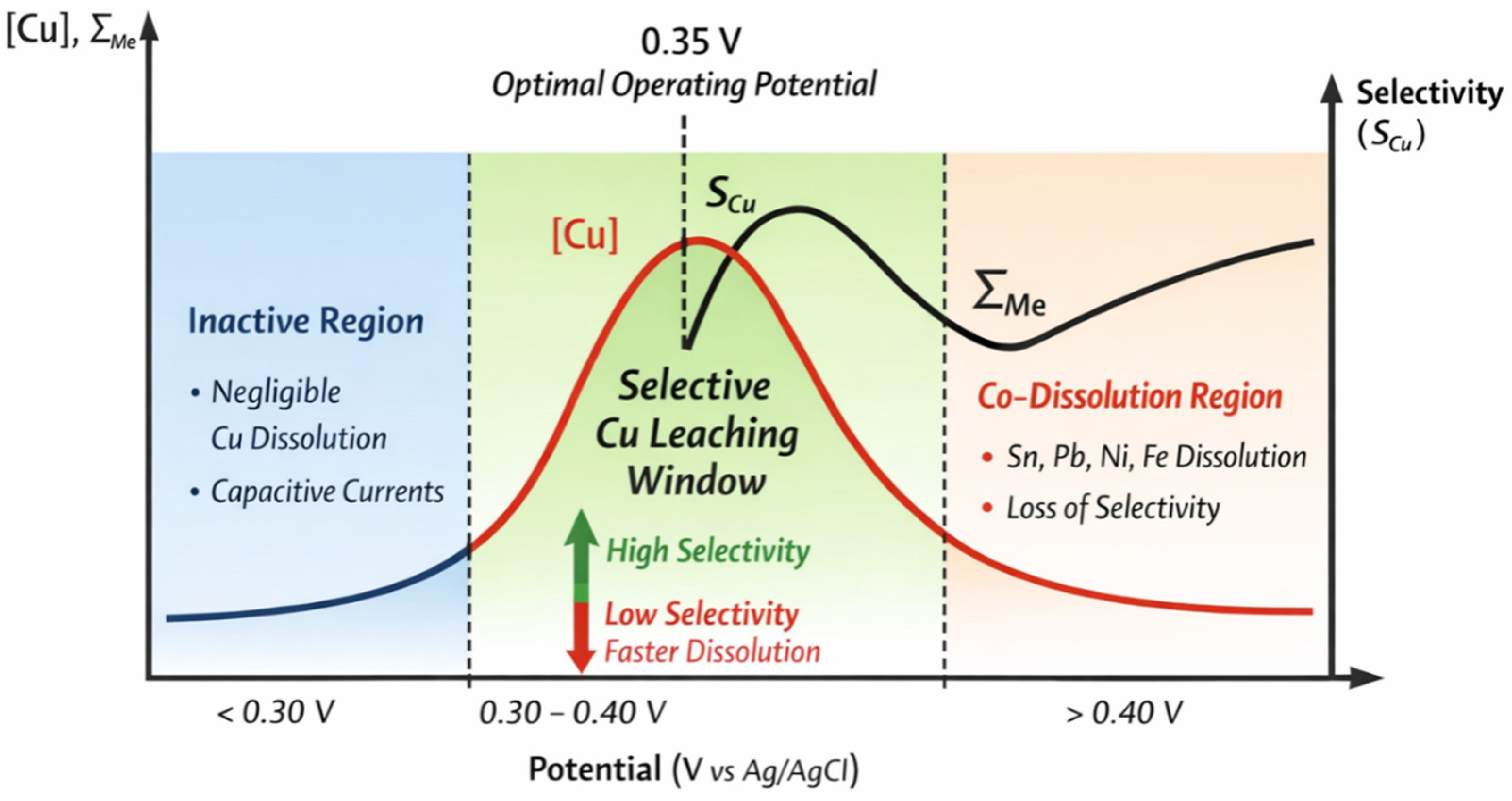 3.2. Potential Window and Selectivity of Copper Leaching