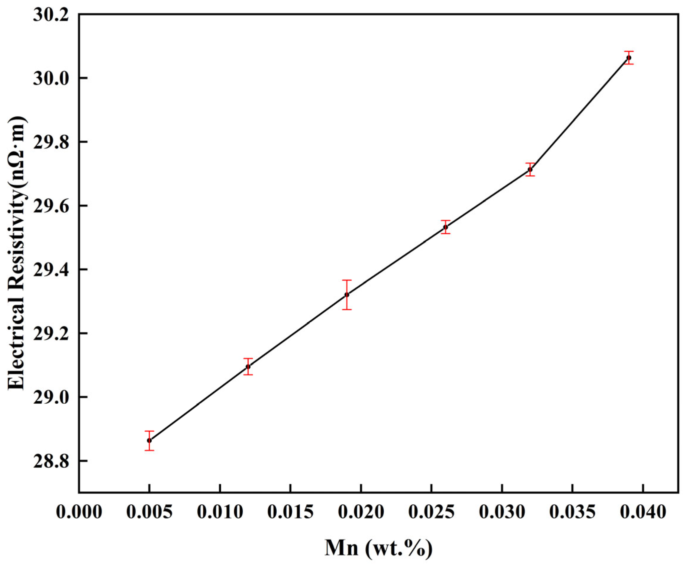 - For the production of 8030 aluminum rods used in the electrical cable industry, the impurity element Mn significantly affects the electrical resistivity of the aluminum rods, causing a rapid increase. The content of Mn in the aluminum rod must be strictly controlled.