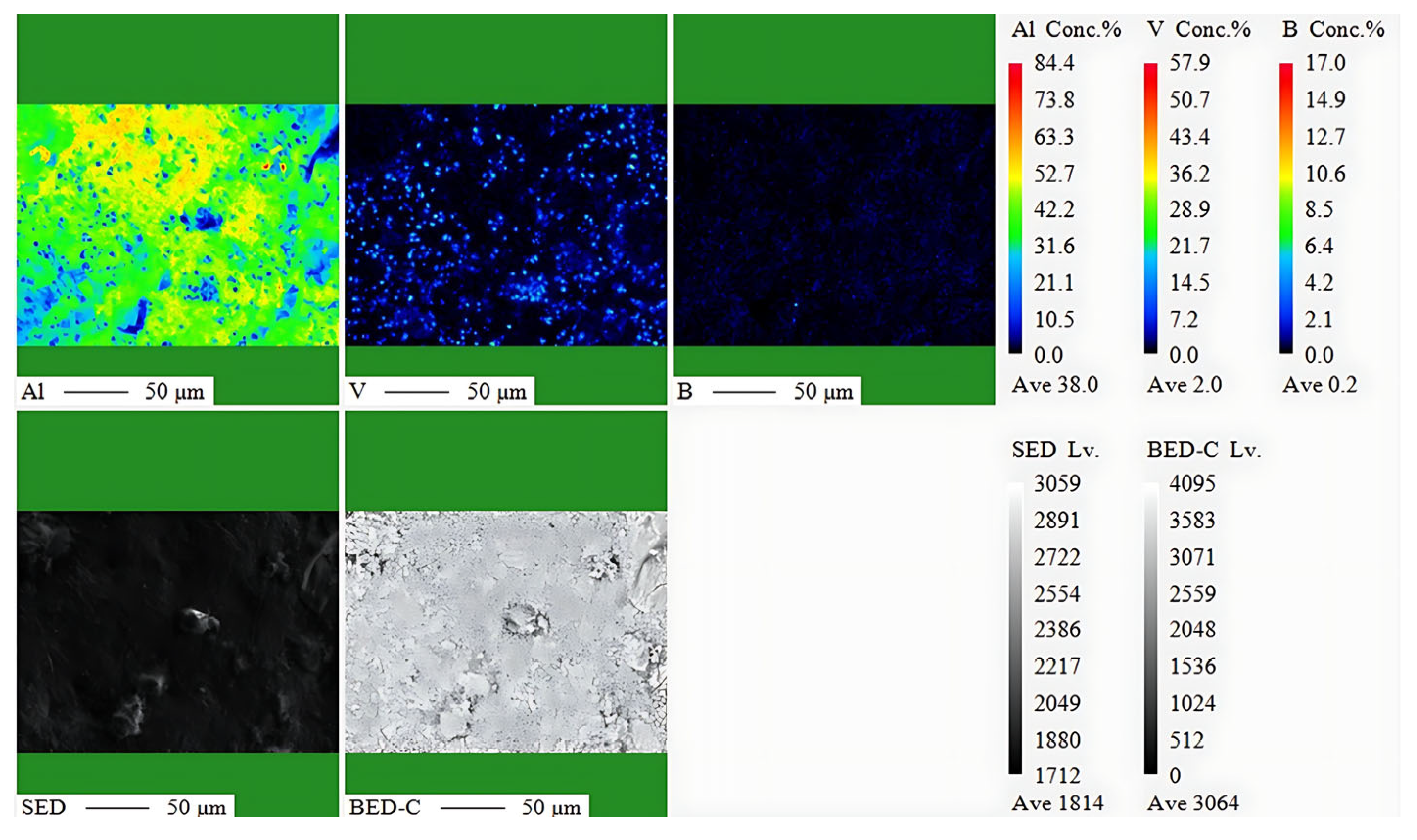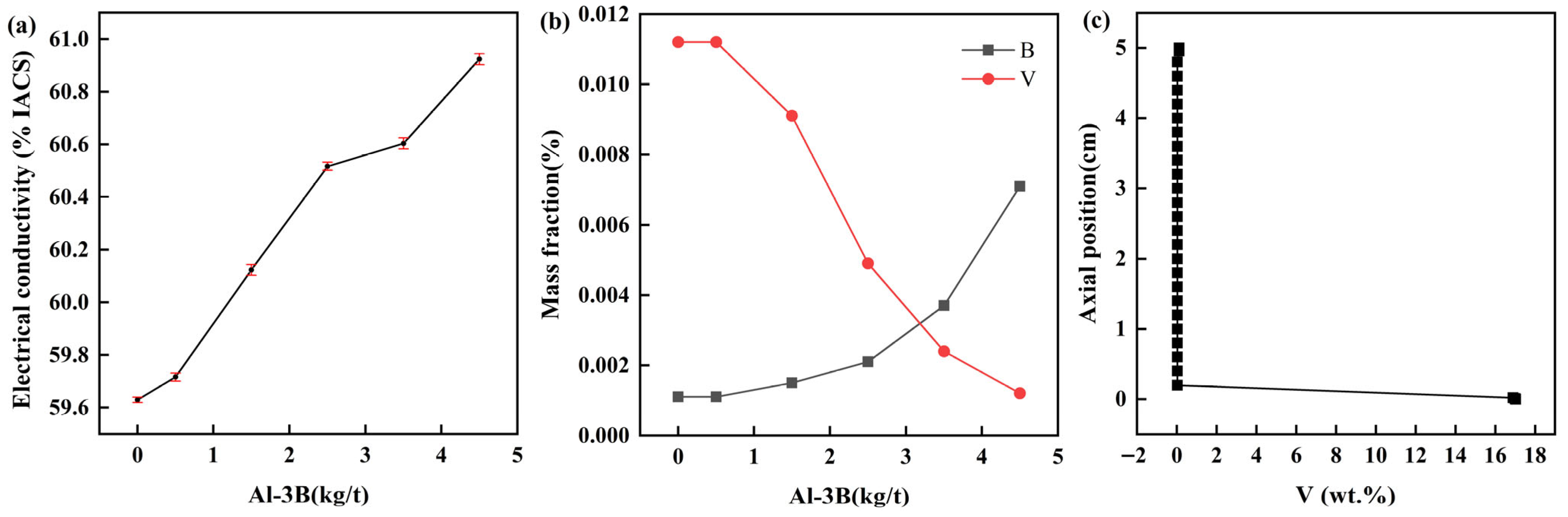 - The addition of B has a highly significant effect in removing the impurity element V from the 8030 aluminum rod, thereby significantly reducing the influence of V on the electrical resistivity. The formed VB2 tends to concentrate at the bottom of the melt. However, the content of Al-3B must also be controlled within a reasonable range.