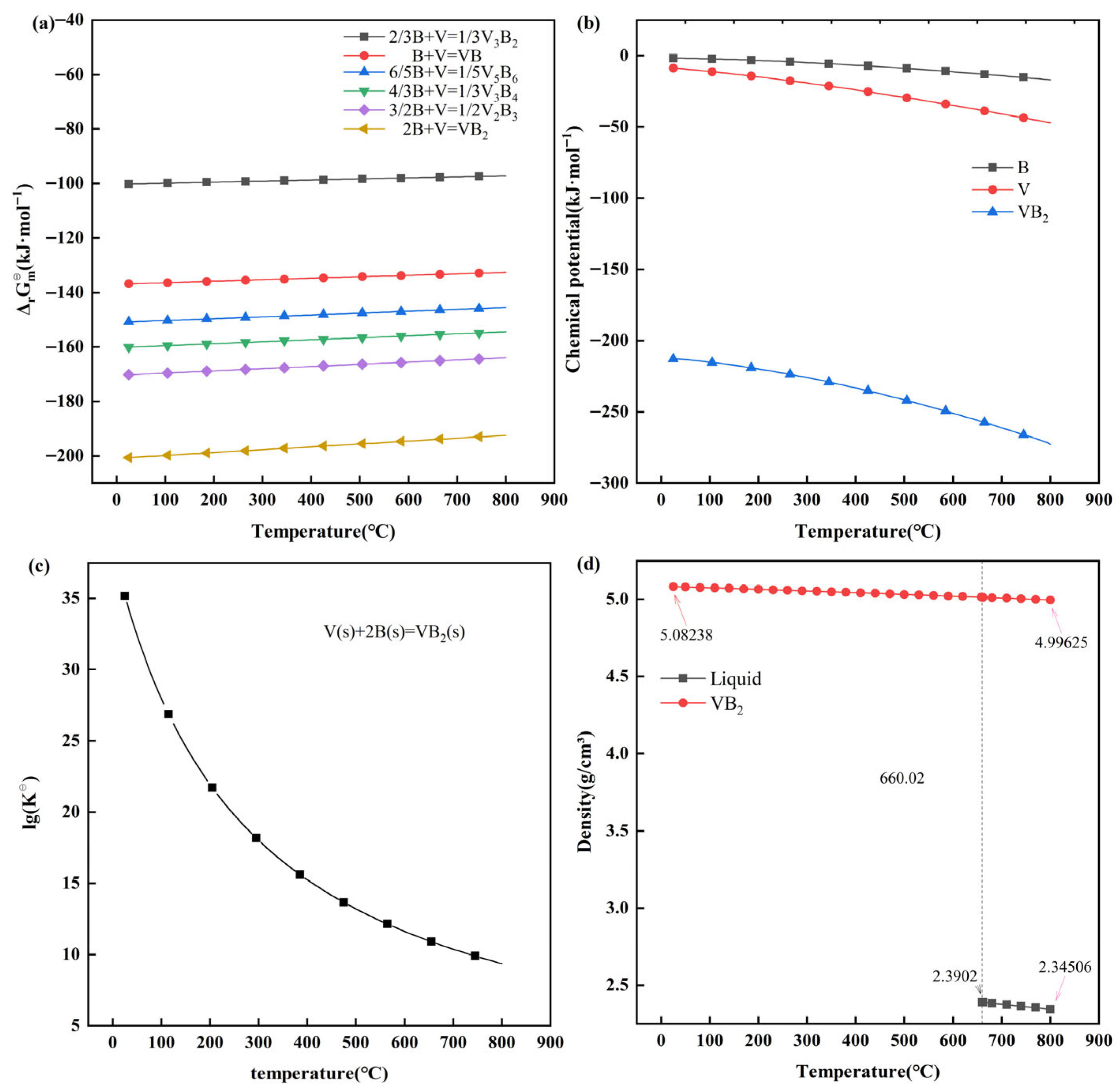 - Khaliq, A.; Ali, H.T.; Yusuf, M. Thermodynamic and Kinetic Analysis of CrB2 and VB2 Formation in Molten Al–Cr–V–B Alloy. Trans. Nonferrous Met. Soc. China 2021, 31, 3162–3176. [Google Scholar] [CrossRef]
