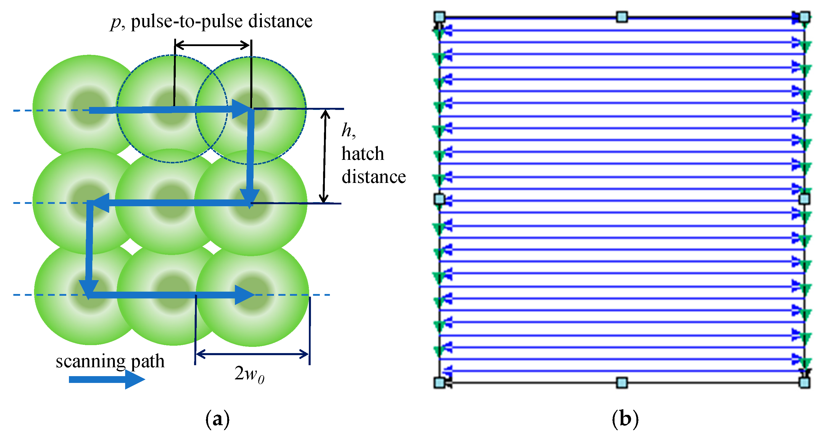 - Zhang, J.J.; Zhao, L.; Rosenkranz, A.; Song, C.W.; Yan, Y.D.; Sun, T. Nanosecond pulsed laser ablation on stainless steel− combining finite element modeling and experimental work. Adv. Eng. Mater. 2019, 21, 1900193. [Google Scholar] [CrossRef]