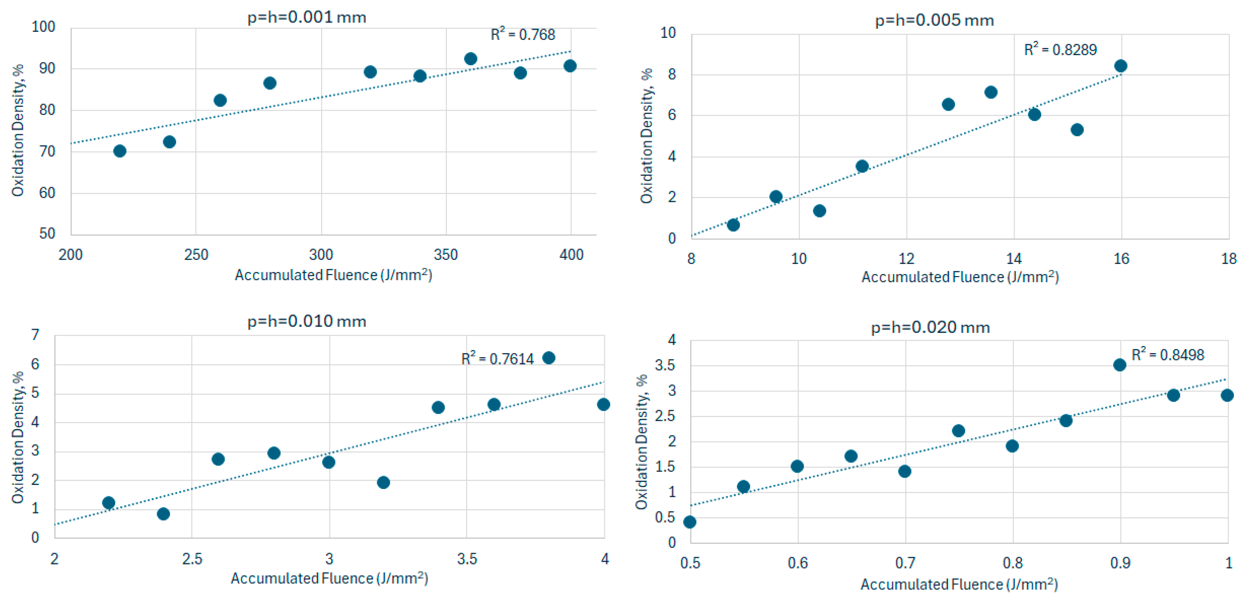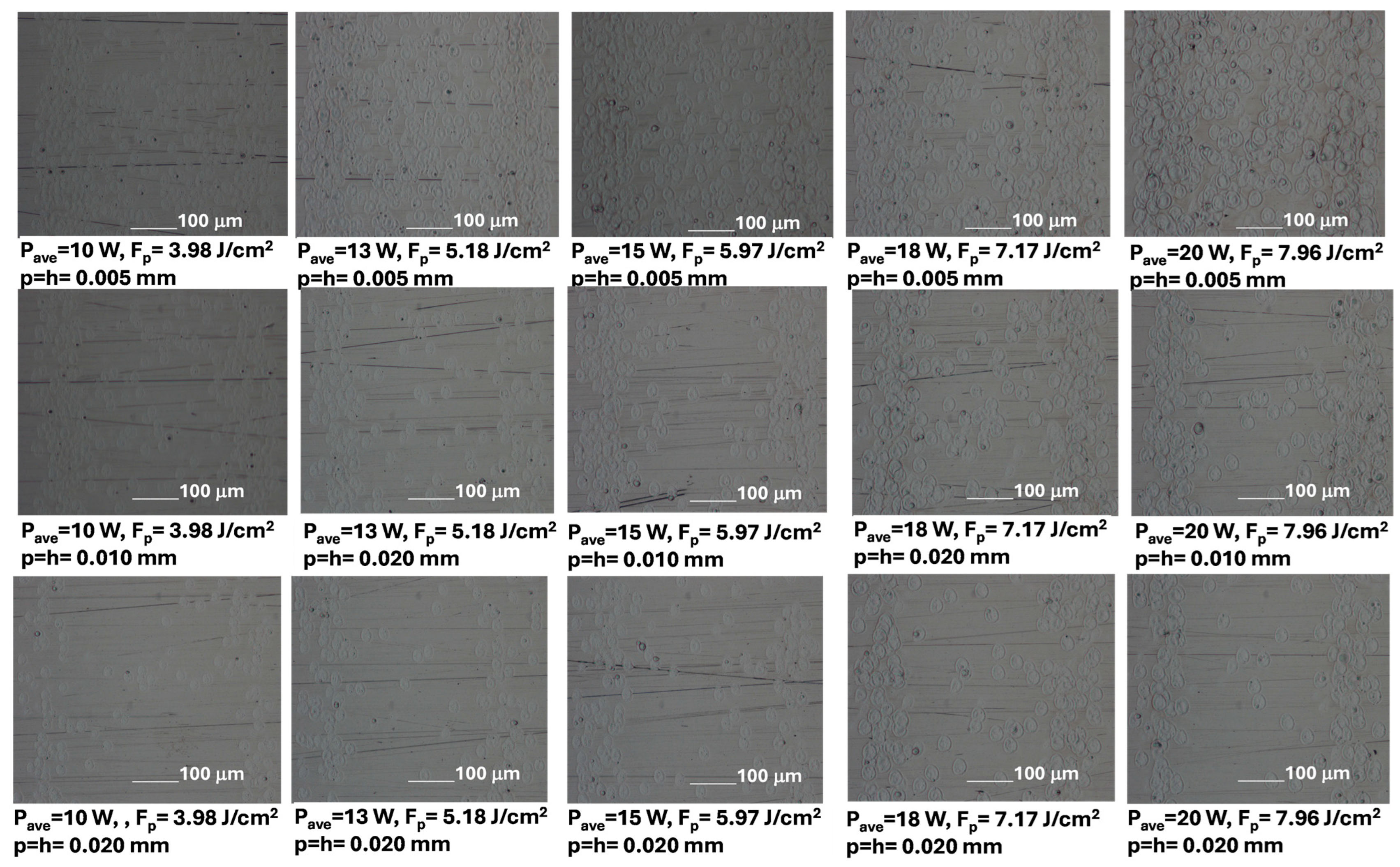 | AISI 316 | Yb-doped fiber laser, s-polarized | 515 nm; 1.5 ns, 1000 kHz; 300–2000 mm/s; 0.001–0.003 mm | LIPSS quality and surface oxidation | [34] |