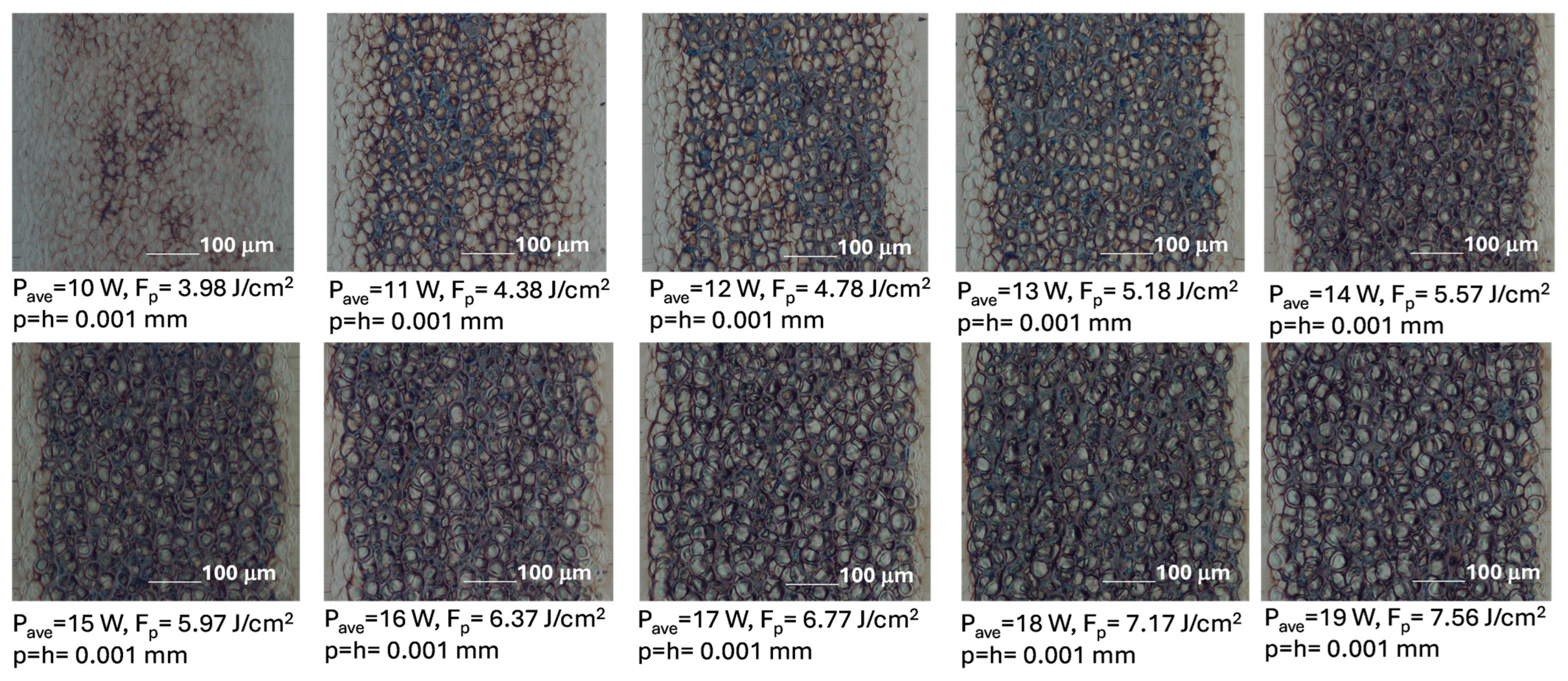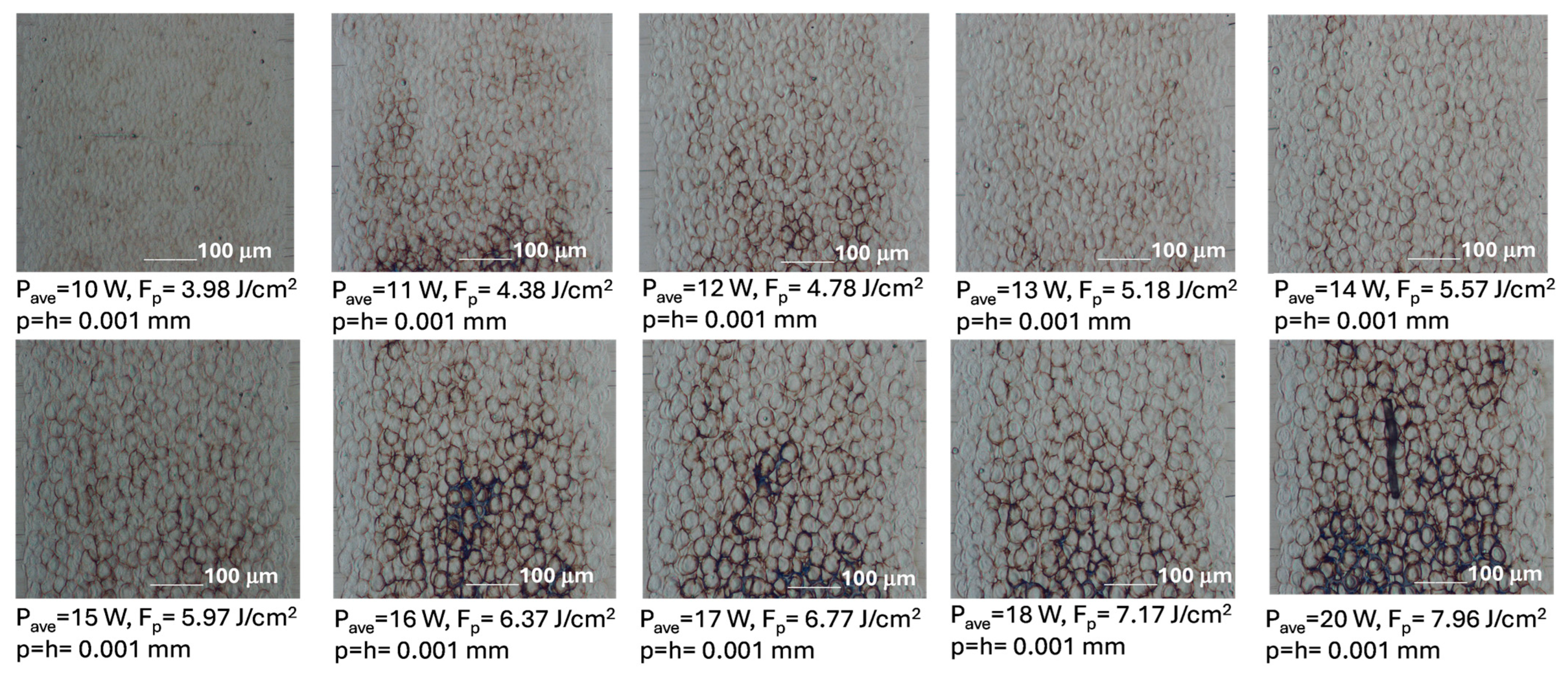 | AISI 304 | Nd: YVO4 | 355 nm; 25 ns; 40 kHz; 400–500 mm/s; 0.03 mm | Surface oxidation | [10] |