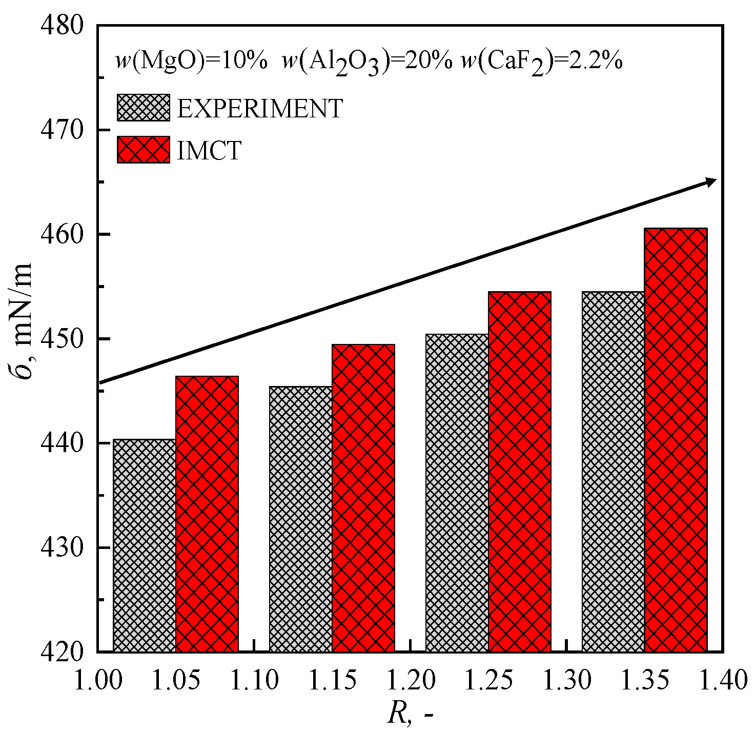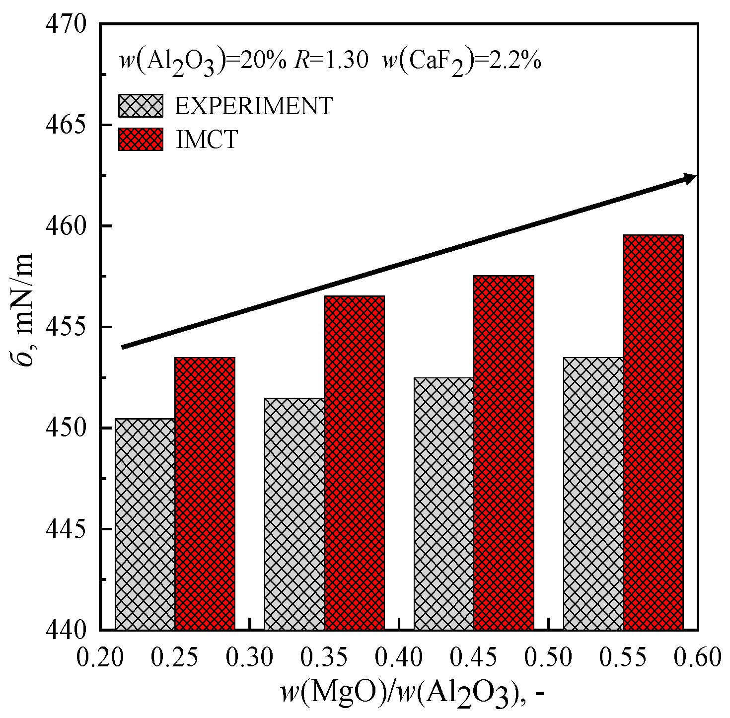 4.3. Effect of w(MgO)/w(Al2O3) on Surface Tension of Slag
