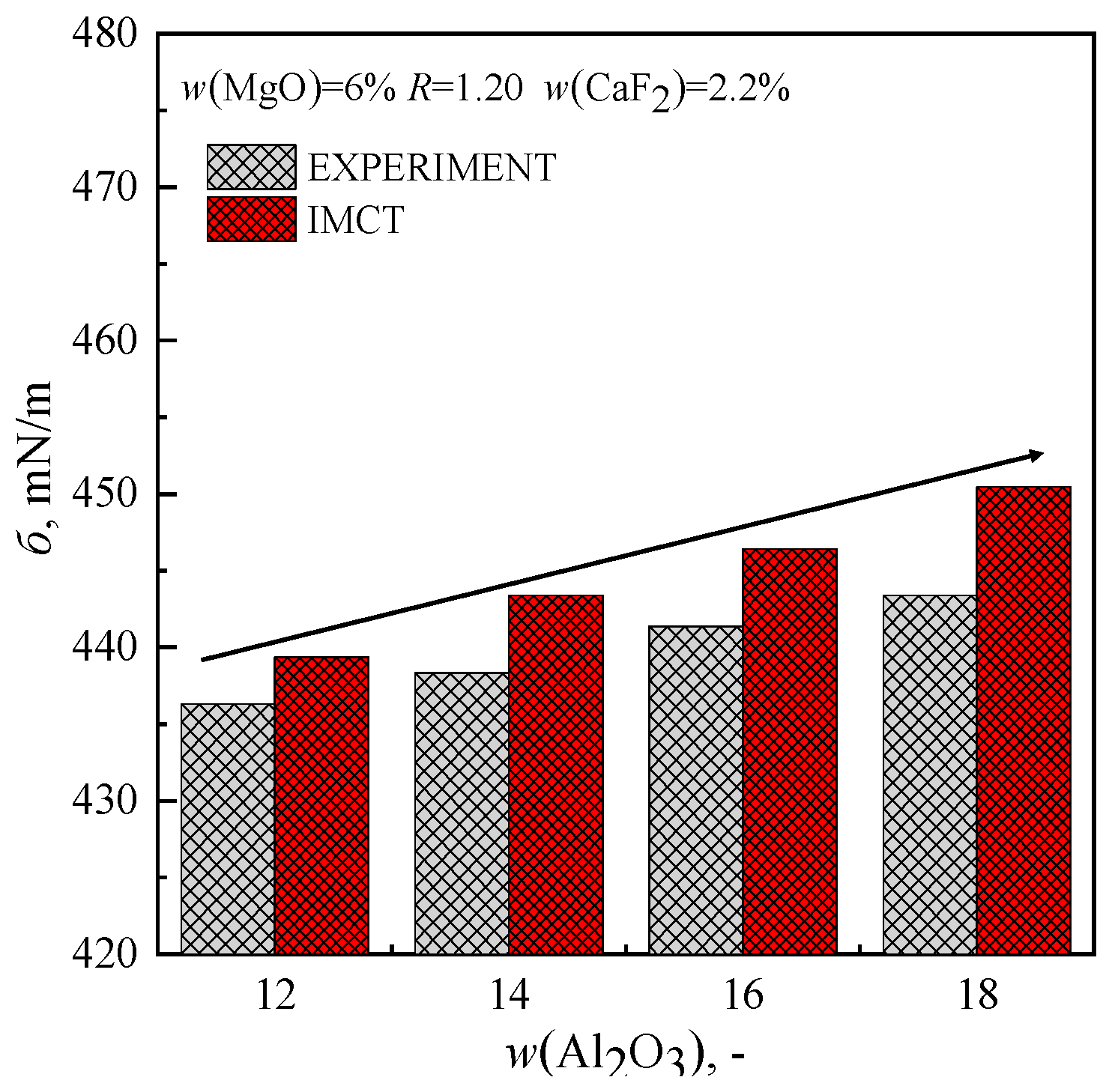 4.4. Effect of w(Al2O3) on the Surface Tension of the Slag