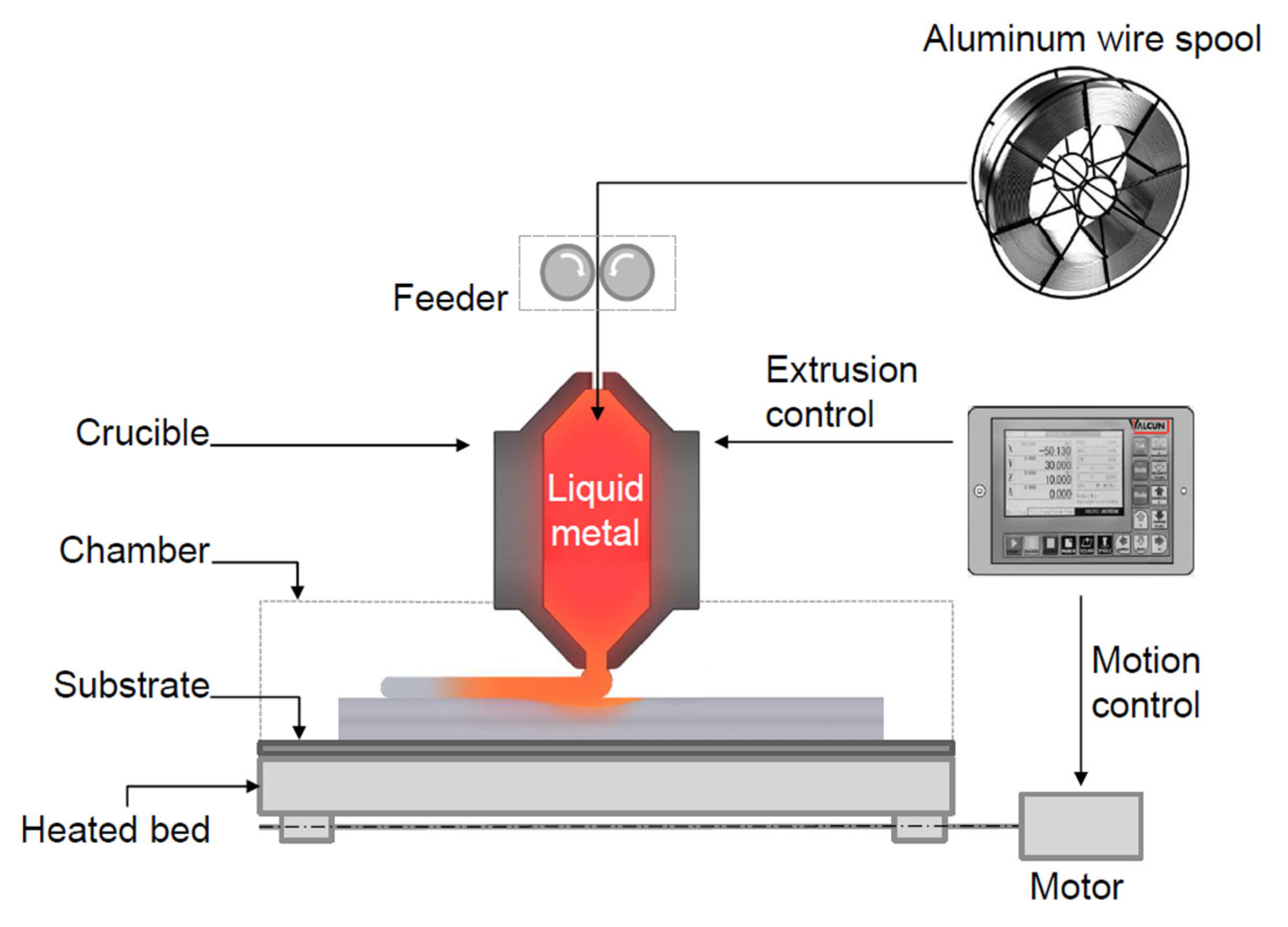 - Reduced energy consumption, as the material is molten in an insulated printhead rather than on the part itself. No active melt pool is formed on the part to overcome latent heat to melt the fed material, as is the case for WAAM and DED processes. Given the high latent heat and the high thermal conductivity, resp 380–470 kJ/kg and 140–250 W/mK depending on the alloy, less energy is required compared to other thermal metal AM processes from WAAM to LPBF [37,38]. This is the main driver for the lower cooling rates and potential to process the unmodified higher strength alloys.