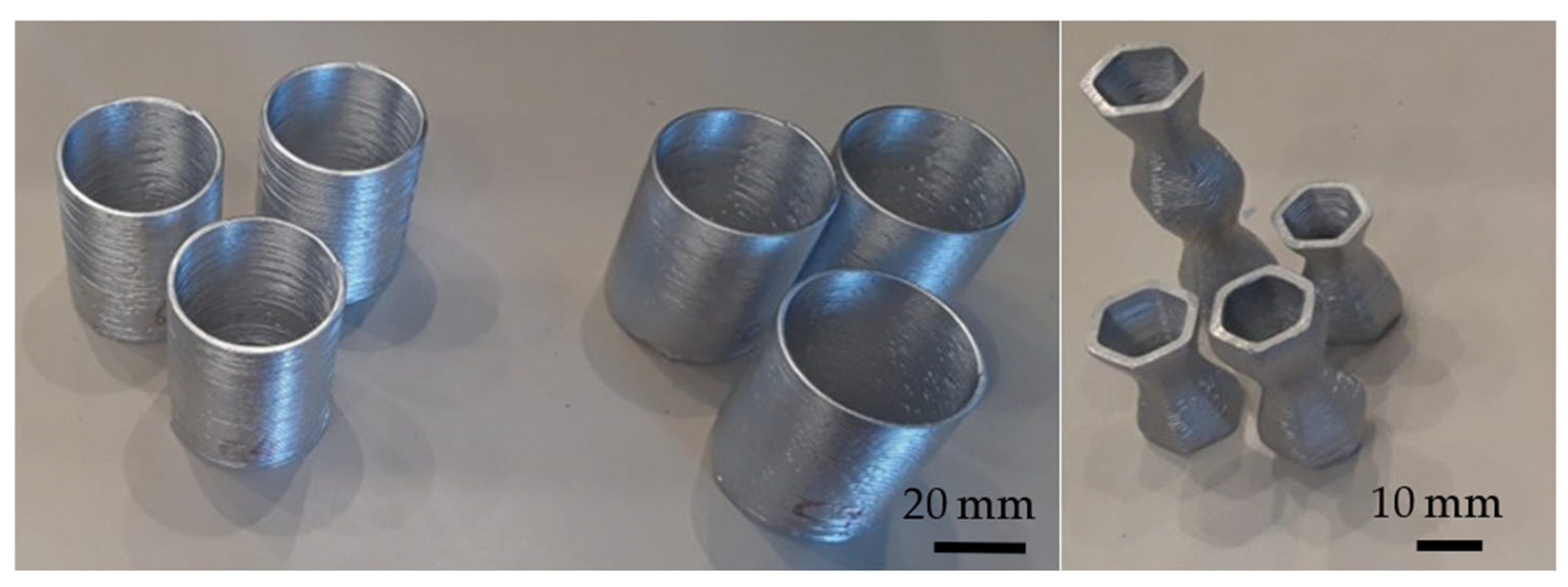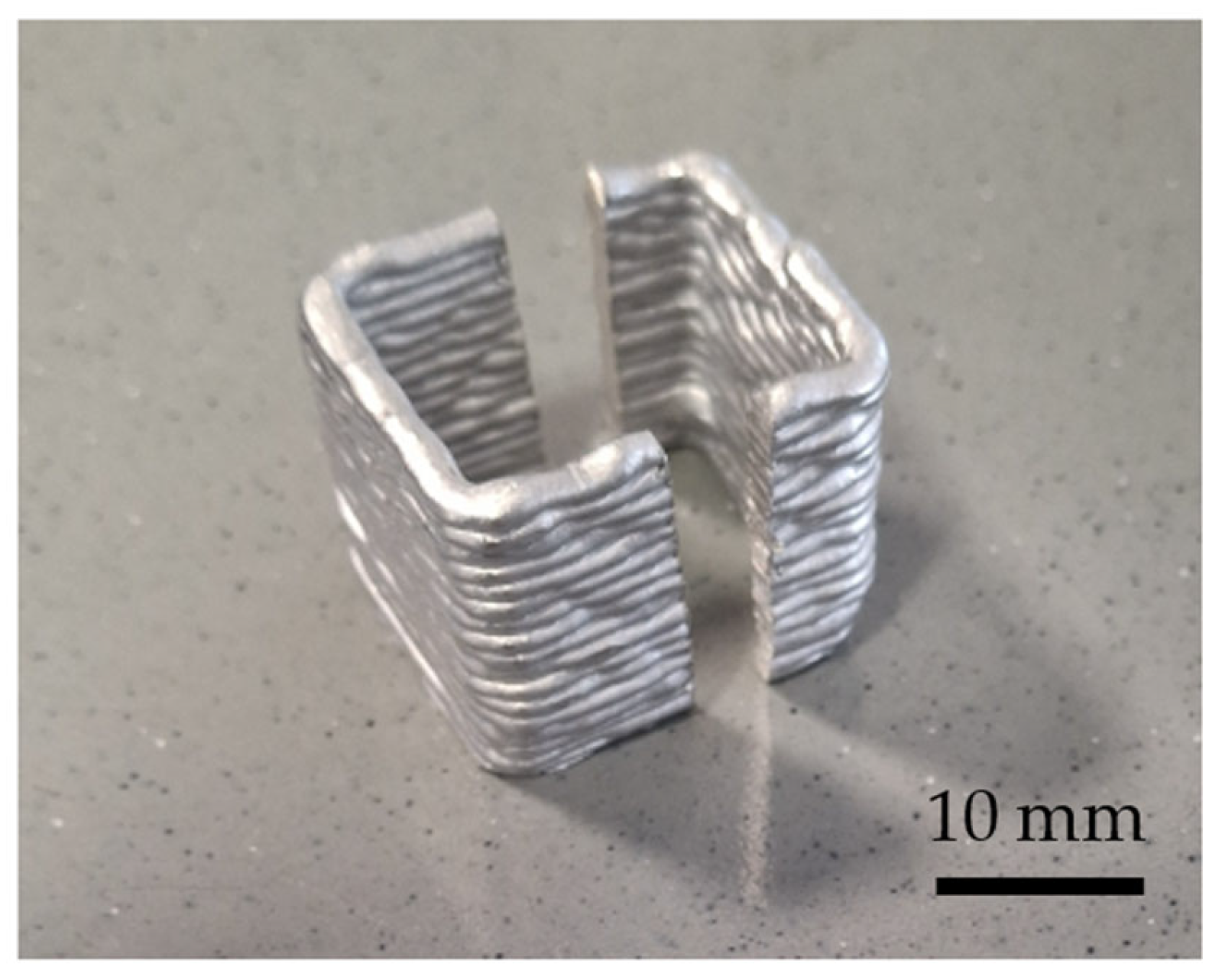 - Hoekstra, E.; Elangeswaran, C.; Hodaei, A.; Dehgahi, S.; Galle, J.; Gibson, I.; Jafari, D. Additive Manufacturing of an Aluminium Alloy by Molten Metal Deposition: A Finite Element and Experimental Study. 2016. Available online: https://ssrn.com/abstract=5074770 (accessed on 22 September 2025).