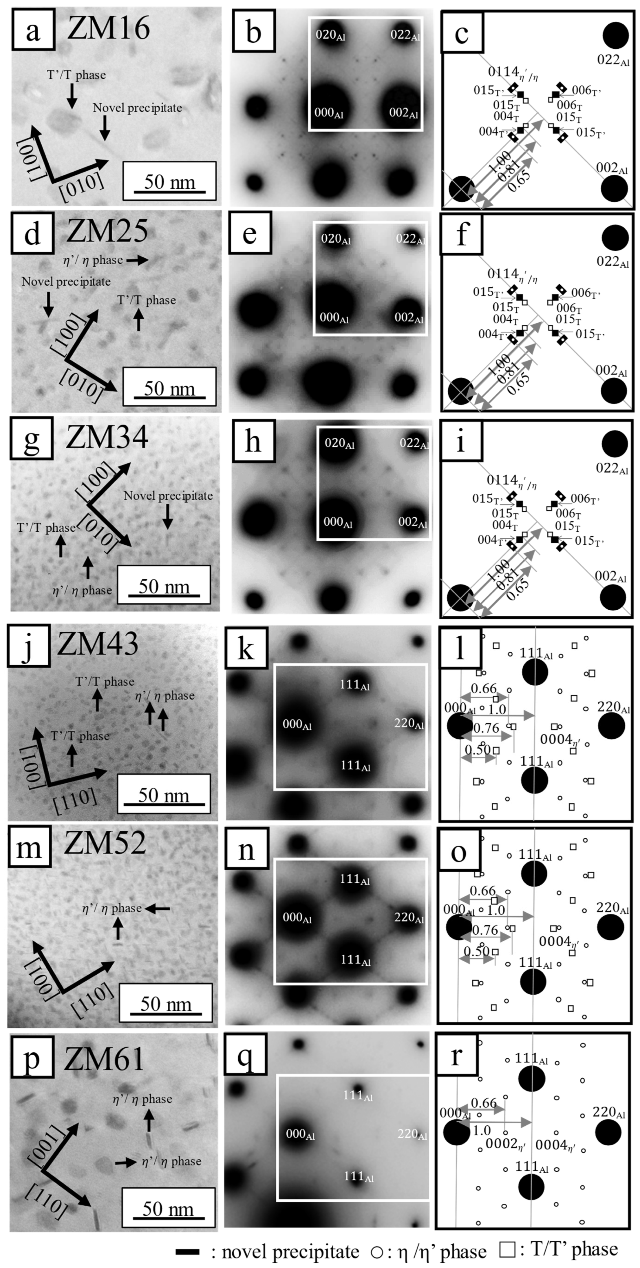 - The age-hardening response increases with increasing precipitate number density up to a Zn/Mg ratio of approximately 1.3 (ZM16, ZM25, ZM34, and ZM43), indicating a strong correlation between precipitate density and age-hardening ability. In addition, the finer precipitates observed in ZM34, ZM43, and ZM52 further contribute to enhanced hardening. The most pronounced age-hardening response is associated with the co-precipitation of η′/η and T′/T phases.