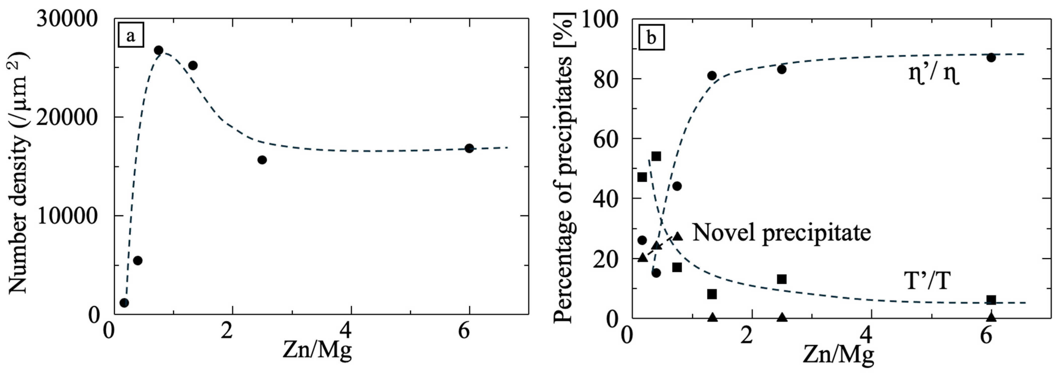- Sanphiboon, W.; Lee, S.; Tsuchiya, T.; Ahmed, A.; Ikeno, S.; Yoshida, T.; Matsuda, K. The microstructural observation in precipitations of peak-aged Al–Zn–Mg alloys with various Zn/Mg ratios. Metals 2025, 15, 1260. [Google Scholar] [CrossRef]