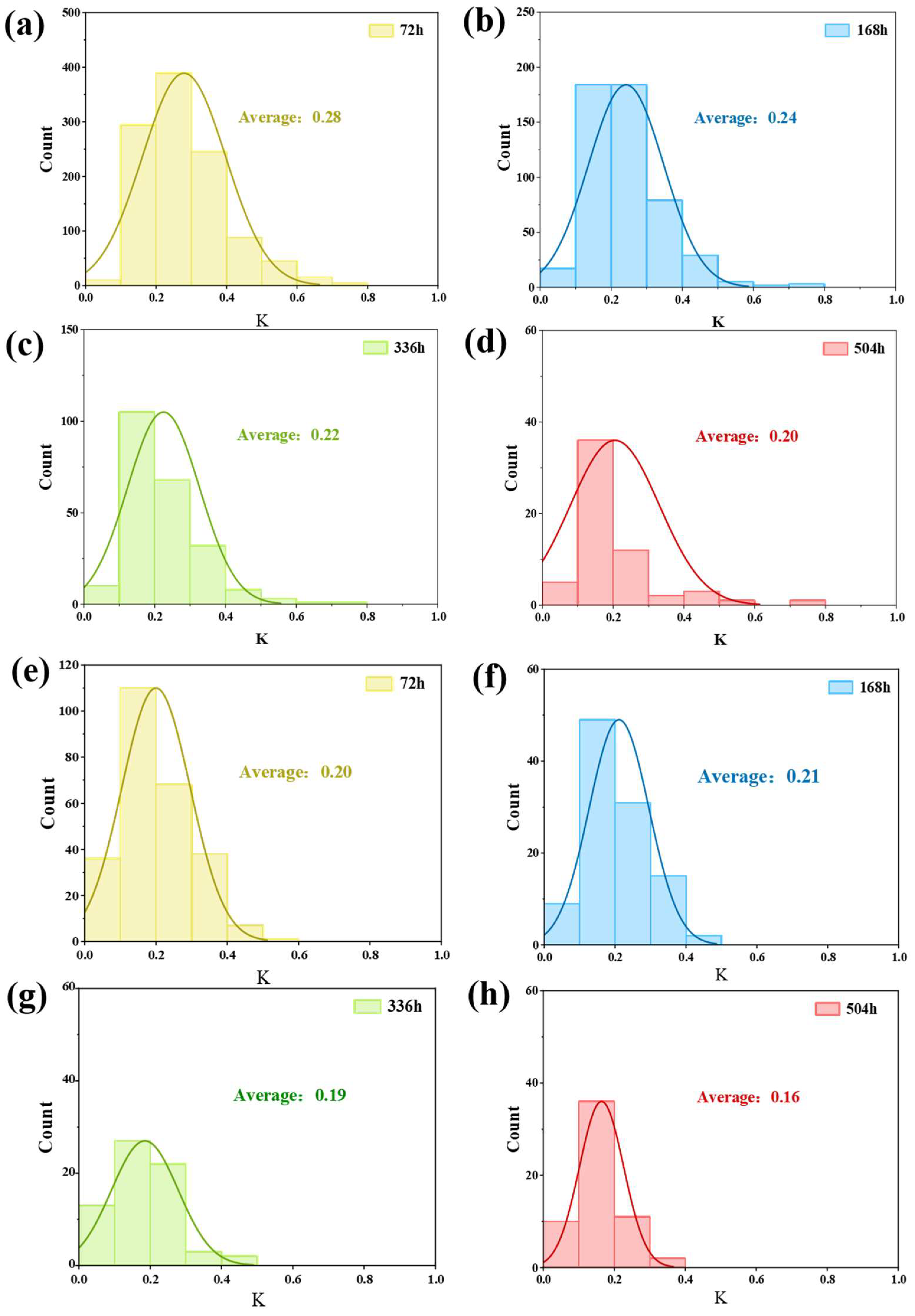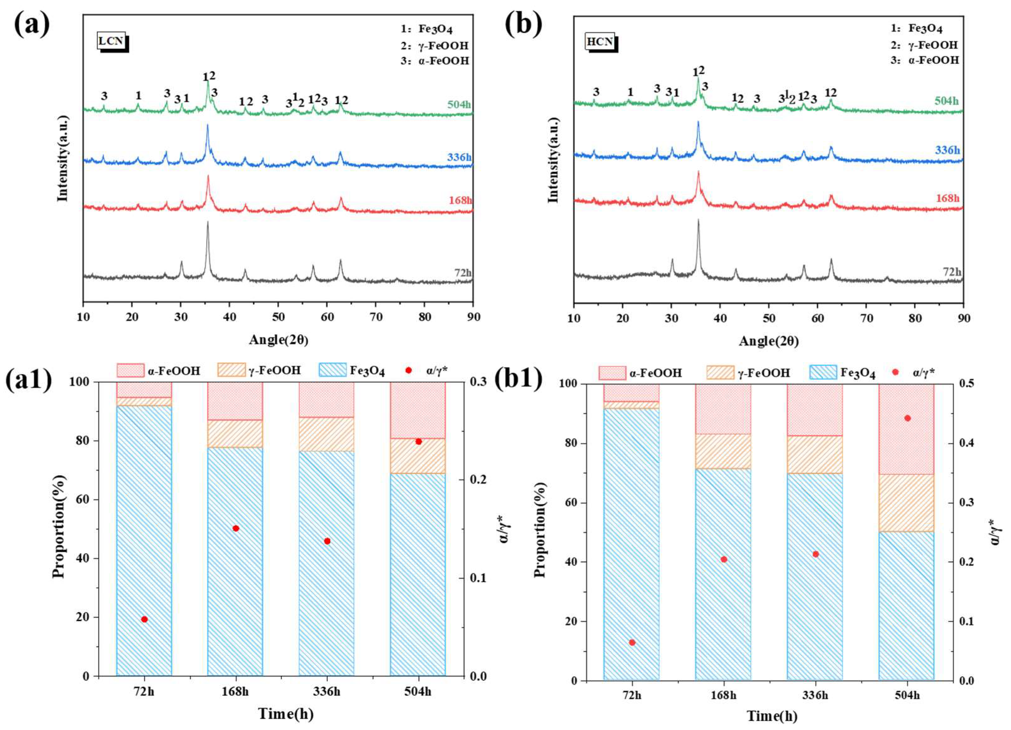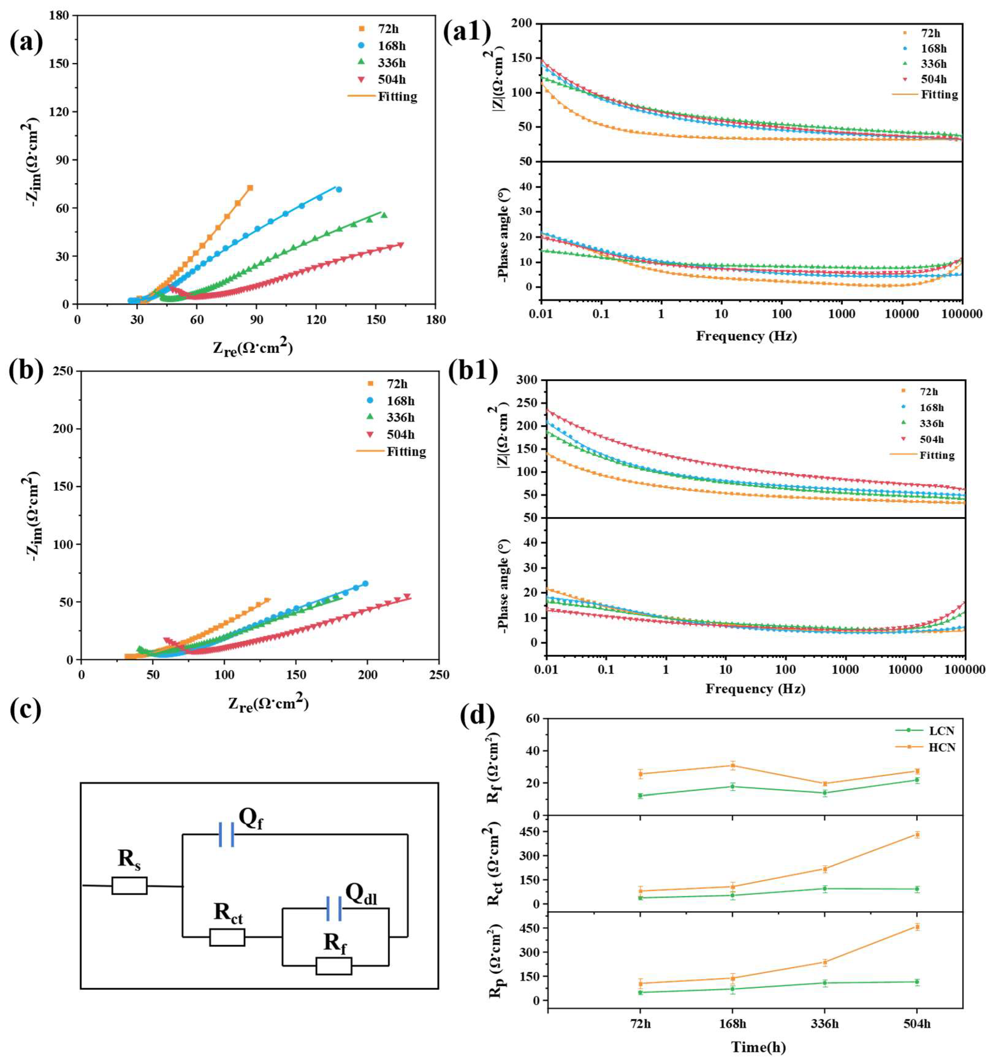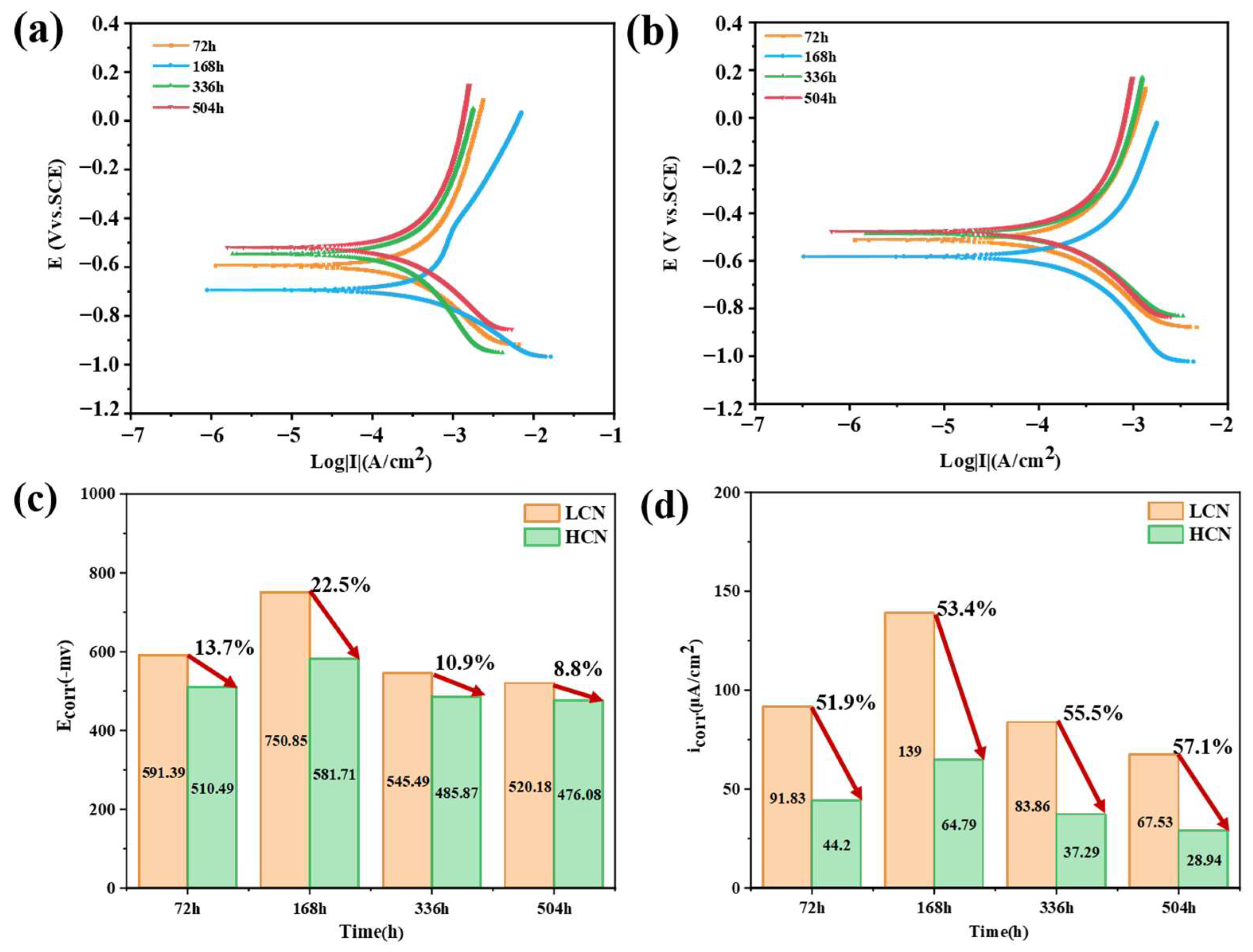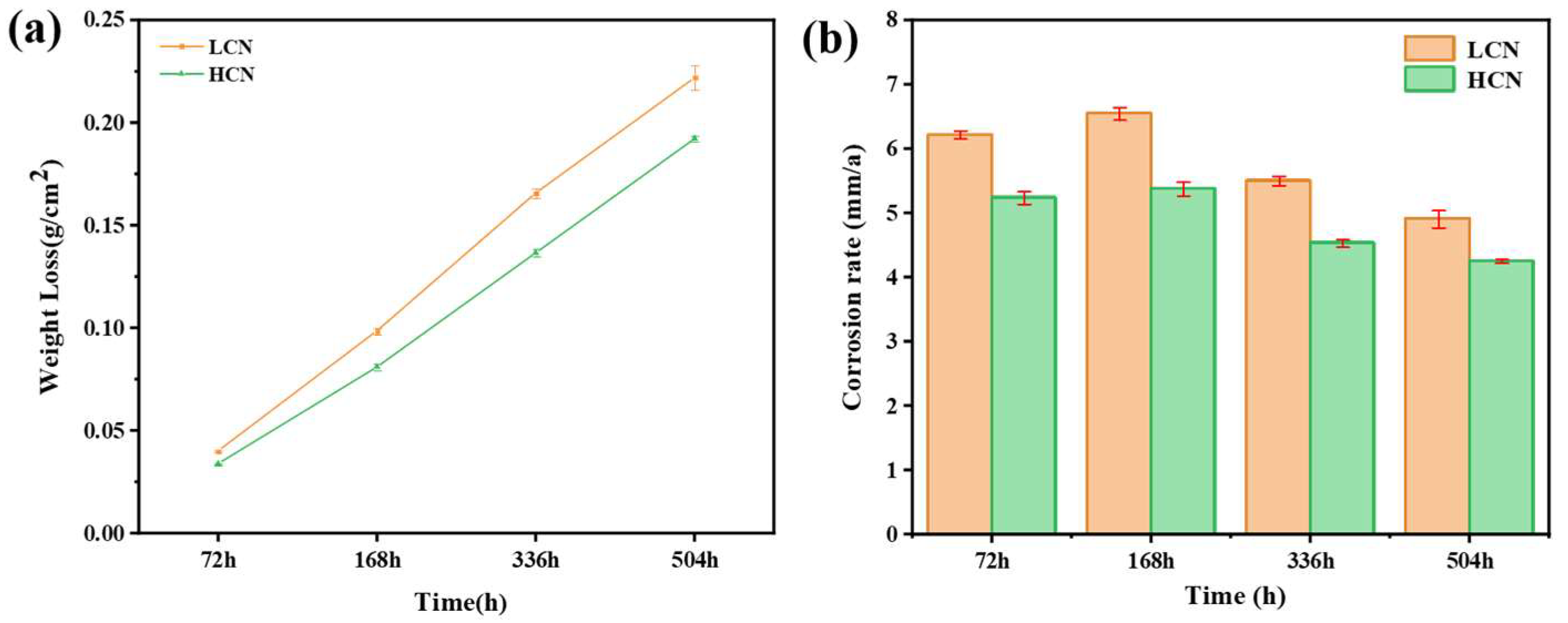 - Both gravimetric measurements and electrochemical parameters indicated a two-stage corrosion process, characterized by early acceleration followed by a late-stage decline. Compared with LCN, HCN exhibited lower mass loss and a lower average corrosion rate, and PDP measurements yielded a lower icorr (28.94 vs. 67.53 μA·cm−2 at 504 h).