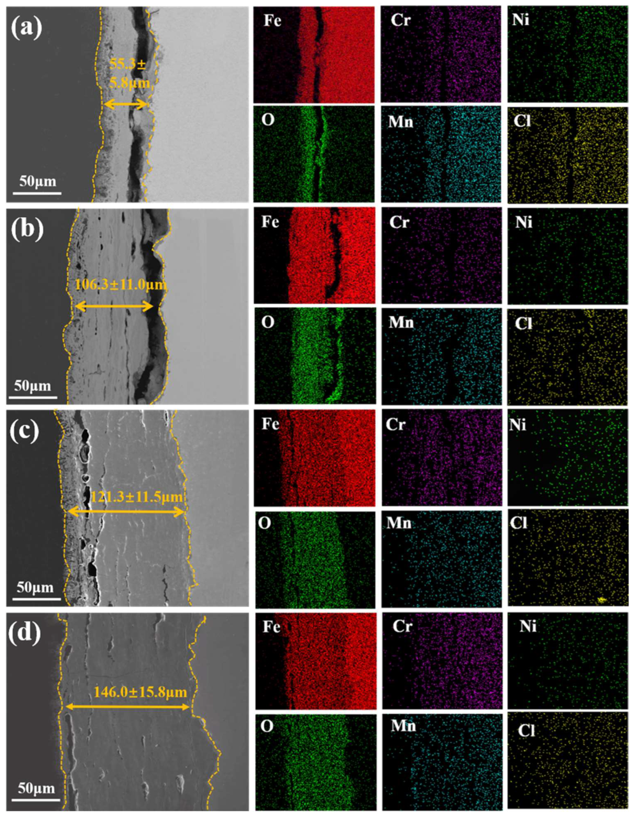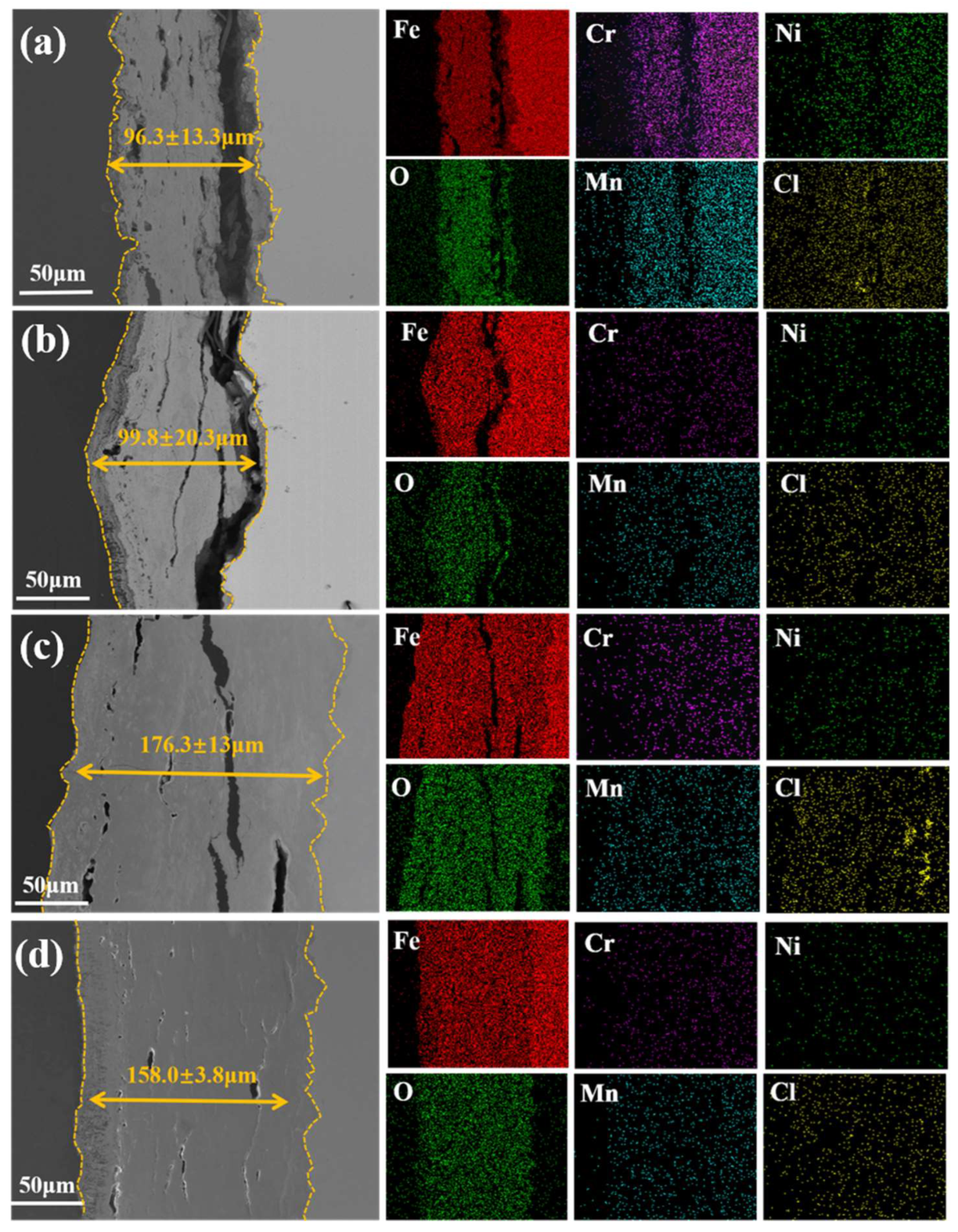 - Hao, L.; Cai, X.; Chen, T.; Zhang, C.; Liu, C.; Cheng, X.; Li, X. Corrosion Behavior of 650 MPa High Strength Low Alloy Steel in Industrial Polluted Environments Containing Different Concentrations of Cl−. Int. J. Miner. Metall. Mater. 2026, 33, 228–241. [Google Scholar] [CrossRef]