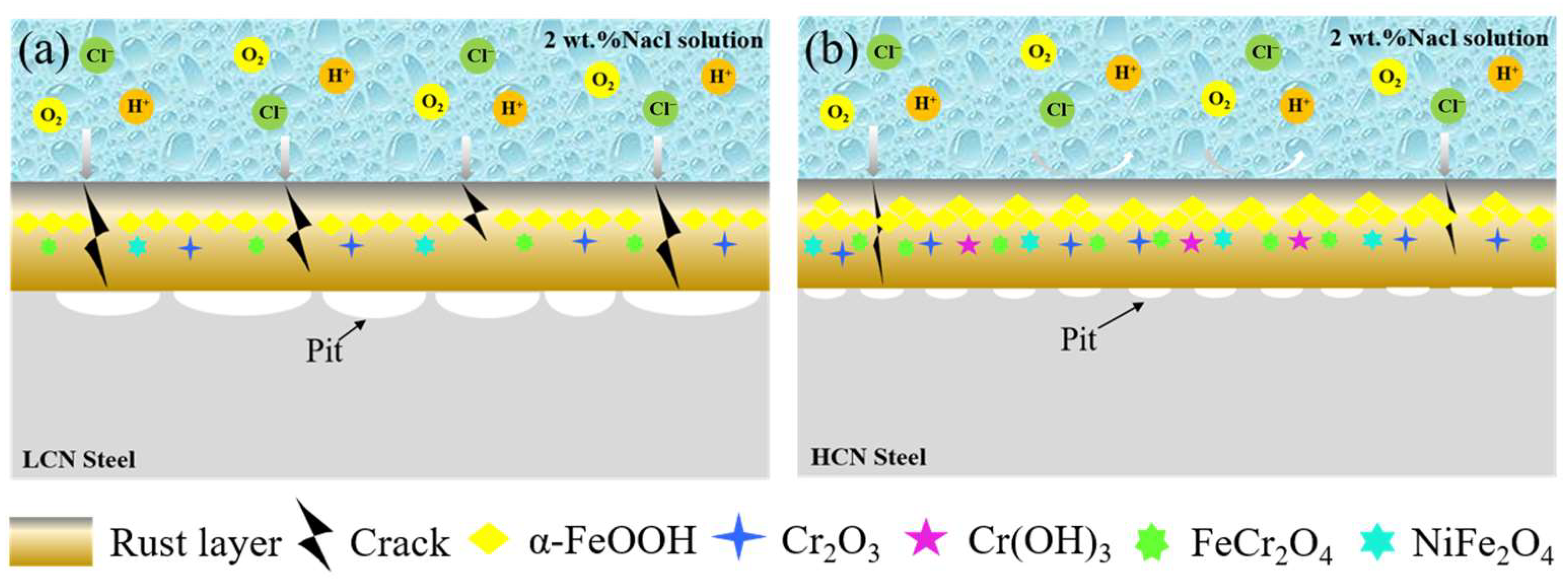 - Liu, W.; Bian, Q.; Liao, J.; Wang, Q.; Pan, H.; Cao, F.; Wu, Z. Influence Mechanism of Ni Content on Corrosion Behavior of Weathering Steel under the Simulated Industrial Atmosphere. J. Solid State Electrochem. 2025, 29, 4623–4639. [Google Scholar] [CrossRef]
