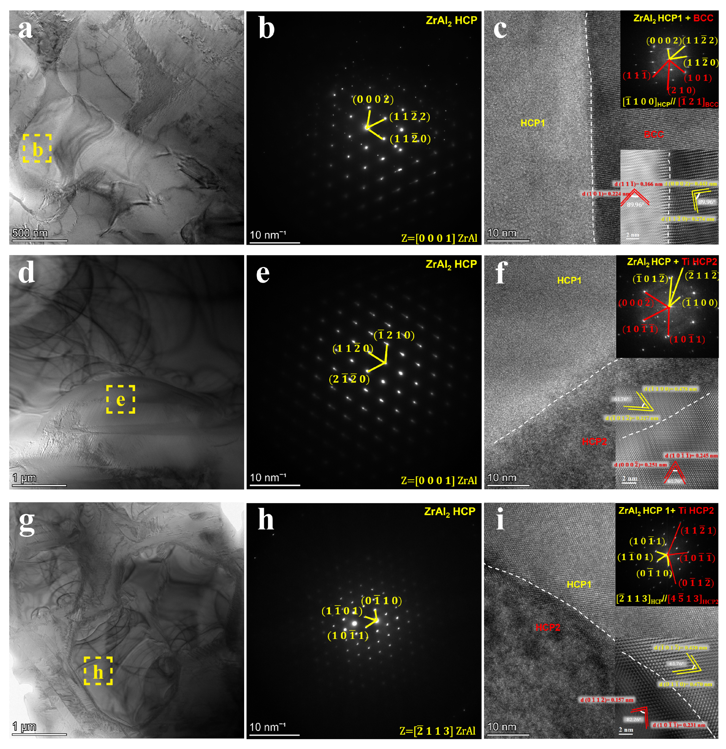 - With increasing Zr content, the volume fraction of the second phase gradually increased from 0% to 100%. The Zr0 alloy exhibited a single-phase BCC structure. The Zr0.5 and Zr1.0 alloys were composed of a BCC matrix and ZrAl2-type C14 Laves phase. The Zr1.5 alloy consisted of BCC, C14 Laves, and Ti-rich C15 Laves phases. In the Zr2.0 alloy, only C14 and C15 Laves phases were observed, indicating the complete disappearance of the BCC phase.
