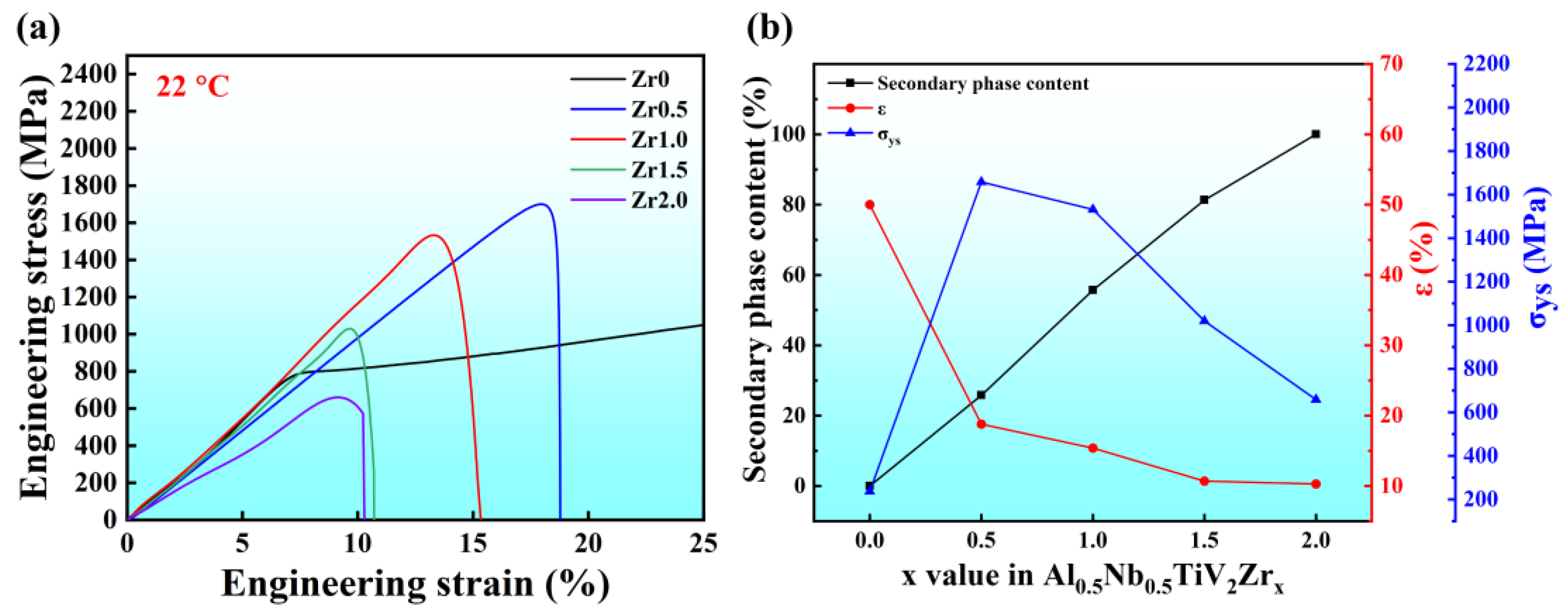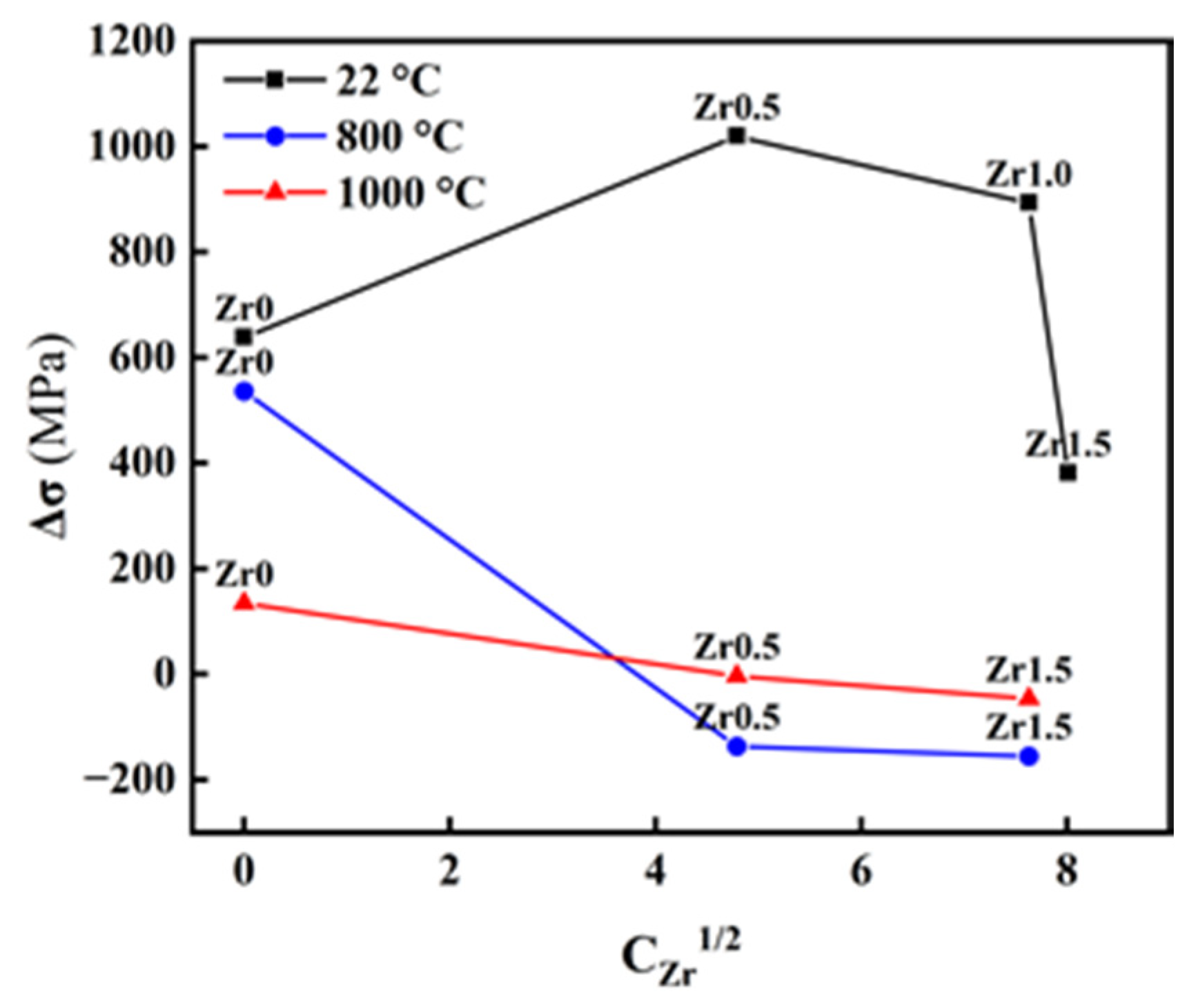- As the Zr content increases, the strength of the Al0.5Nb0.5TiV2Zrx alloys changes significantly. At 22 °C, the yield strength rises sharply from 638.5 MPa for Zr0 to 1658.1 MPa for Zr0.5, primarily due to solid-solution strengthening induced by Zr and second-phase strengthening from the precipitation of a moderate amount of Laves phase. However, when the Zr content increases further to Zr1.0 and above, the yield strength gradually decreases to 658.2 MPa. This reduction is attributed to stress concentration caused by the excessive precipitation of the second phase, which diminishes the effect of solid-solution strengthening. At 800 °C and 1000 °C, the yield strength further decreases, likely due to the increased brittleness and instability of the Laves phase at elevated temperatures, causing the strengthening effect to gradually diminish.