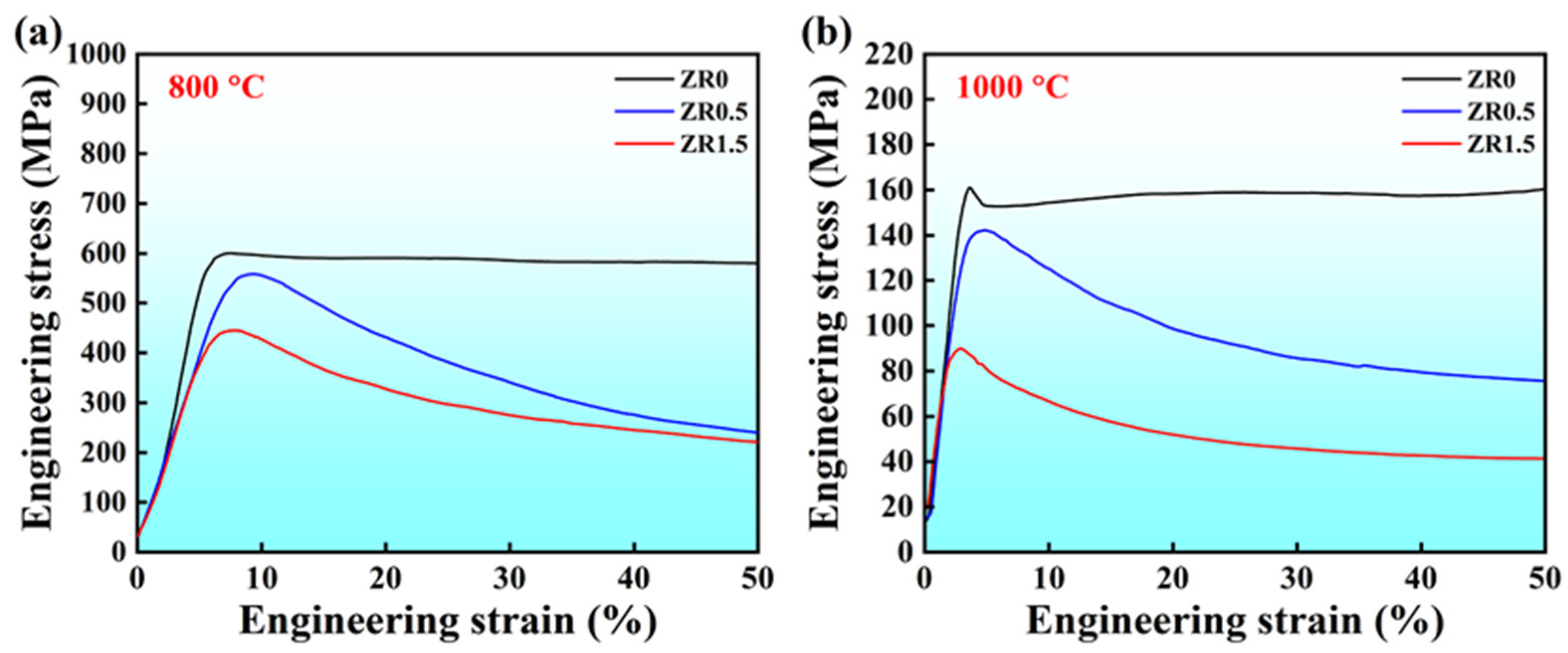 - The plasticity of the alloys exhibited a complex relationship with Zr content. At 22 °C, the plasticity decreased from 18.8% for Zr0.5 to 10.3% for Zr2.0. However, at 800 °C and 1000 °C, the plasticity of Al0.5Nb0.5TiV2Zrx (x = 0.5, 1.5) exceeded 50%, indicating that at high temperatures, the second-phase precipitation had no significant impact on plasticity. In contrast, the Zr0 alloy (single-phase BCC structure) exhibited excellent plasticity at both room temperature and high temperatures, with over 50% strain without fracture.