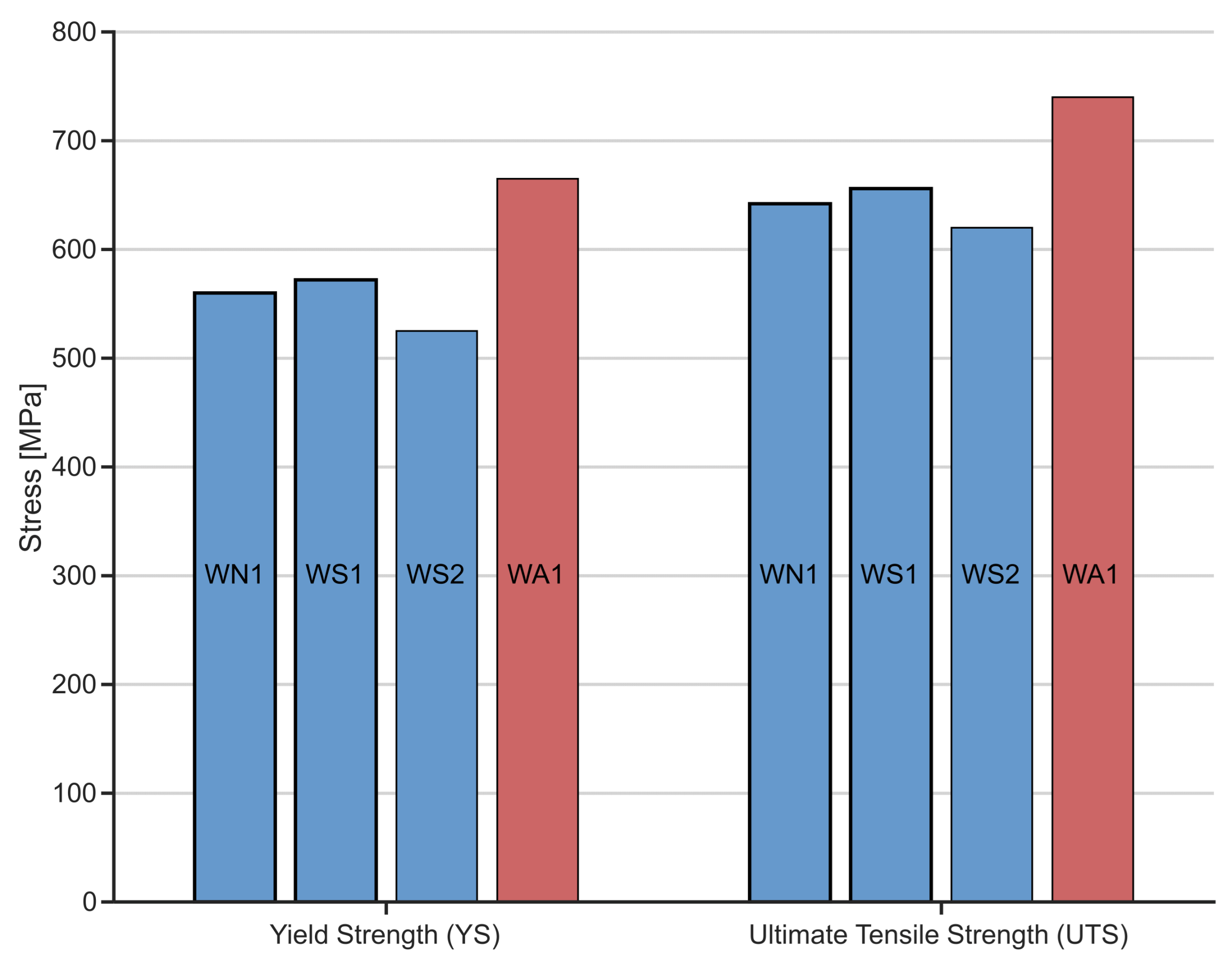 | WS2 [RT] [300 °C] | 525 485 | 620 587 | Post-Weld Heat-Treated 28 h at 550–600 °C and then 28.5 h at 605–635 °C. |