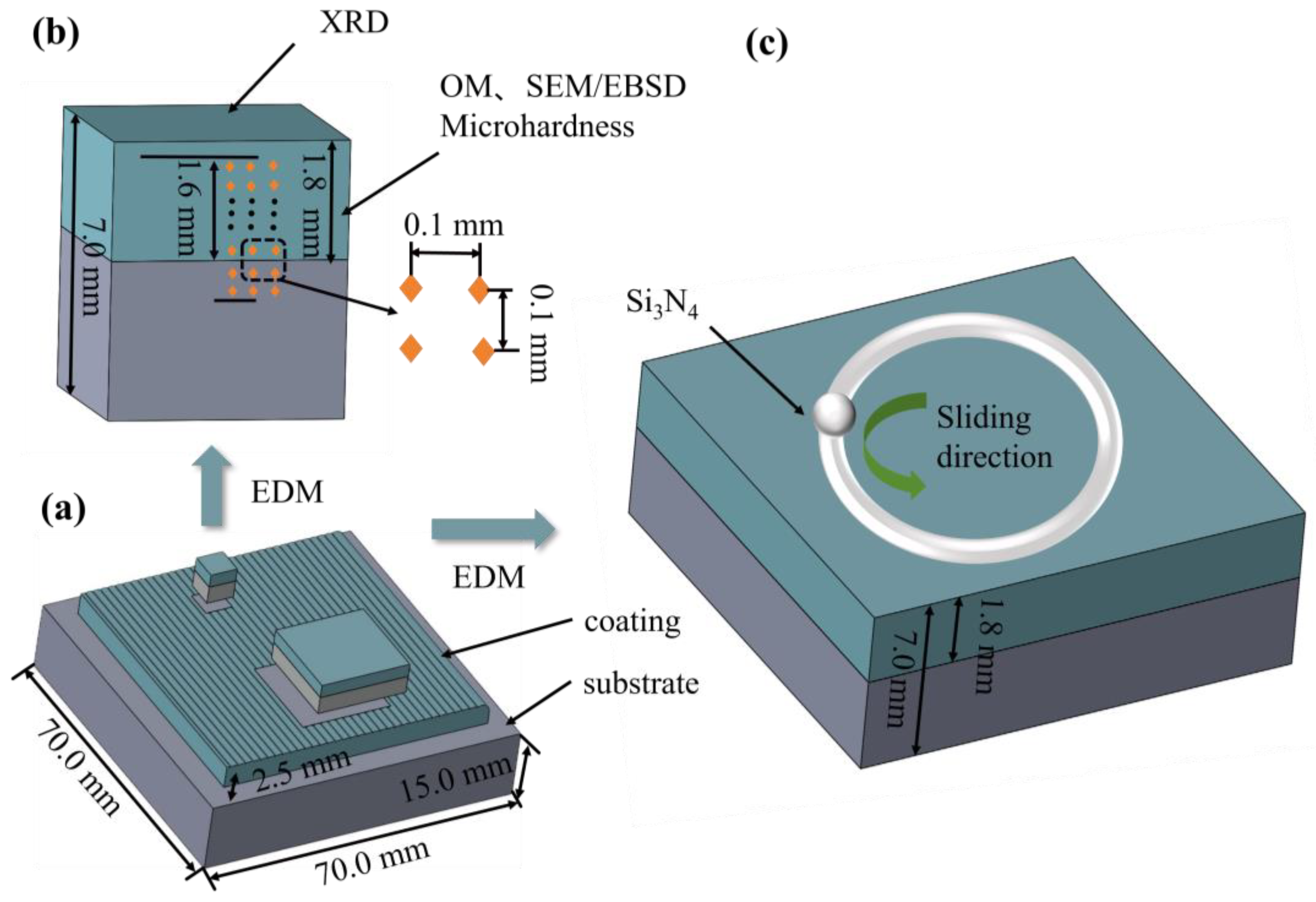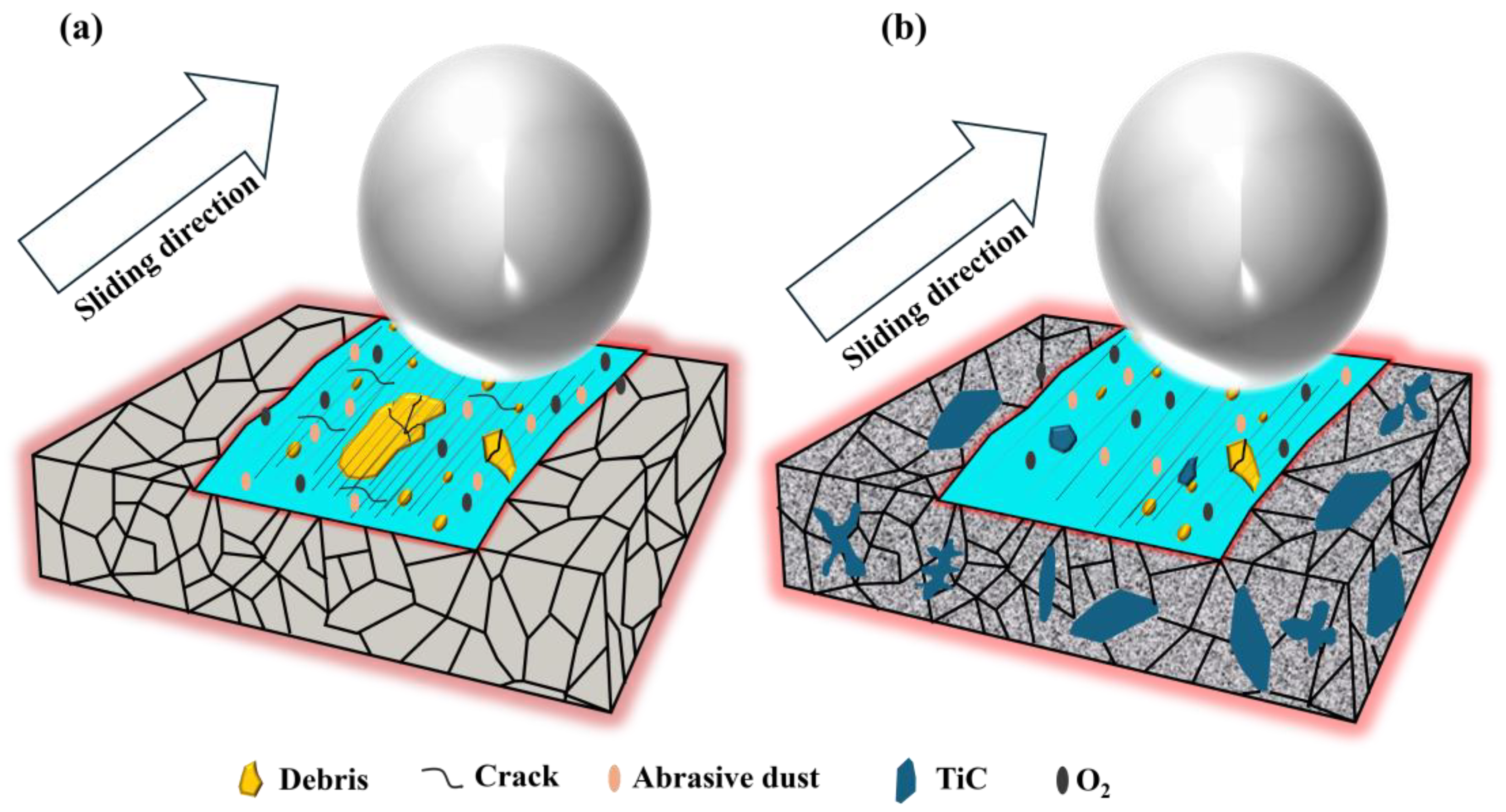 - Zhang, C.-Y.; Li, Z.-S.; Liu, X.-B.; Xie, X.-M.; Li, X.-G.; Zhou, H.-B.; Meng, Y.; Wang, D.-S.; Xie, F. Development and wear performance of ceramic TiC reinforced Ni-based solid lubrication composite coatings by laser cladding. Ceram. Int. 2025, 51, 38884–38898. [Google Scholar] [CrossRef]